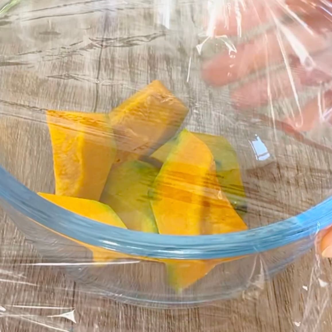 皮とワタを取り除いたかぼちゃを耐熱ボウルに入れ、ふんわりラップをかけて電子レンジ600wで3〜4分加熱。柔らかくなったらフォークでつぶします。