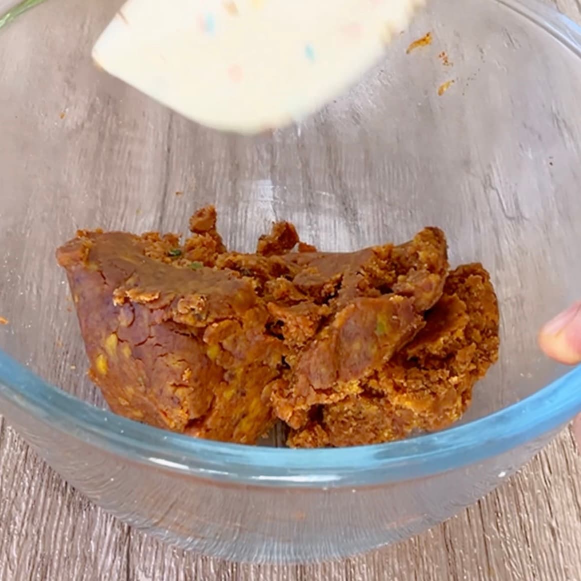 米粉・片栗粉・アーモンドプードルを加え、ひとかたまりになるまで混ぜます。