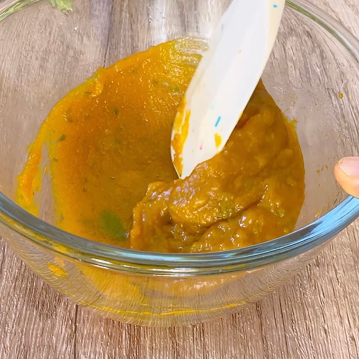 かぼちゃに砂糖と植物油を加え、なめらかになるまでしっかり混ぜます。