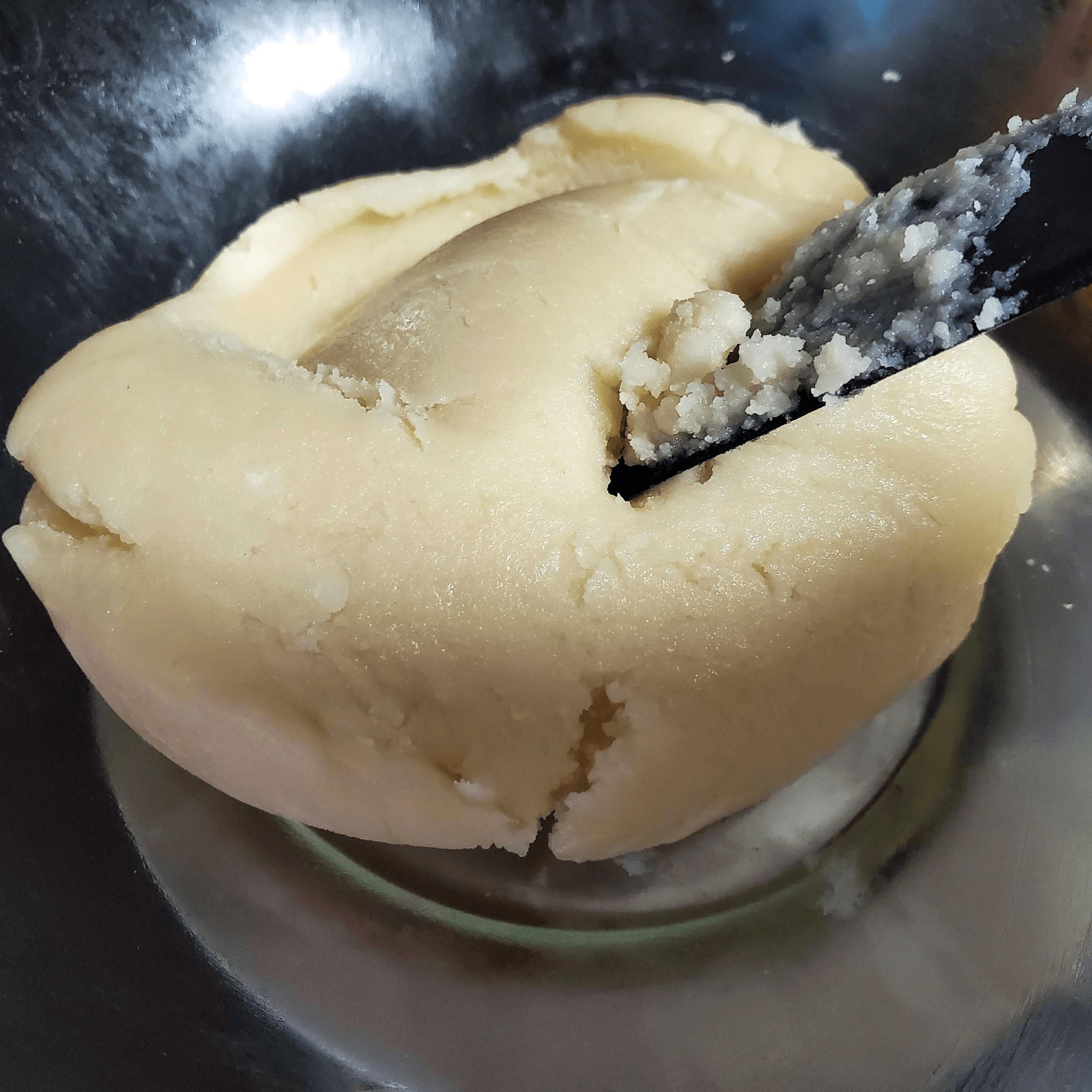 豆乳の量は60g〜で調節してください。米粉の種類によって必要量が変わります。少なすぎると生地がひび割れてしまい、多すぎるとカリッとした食感に仕上がりません。「生地をギュッと握ればぎりぎりまとまる」状態から少しずつ豆乳を足して、しっかりと生地がまとまる最低限のポイントで調整してみて下さい。