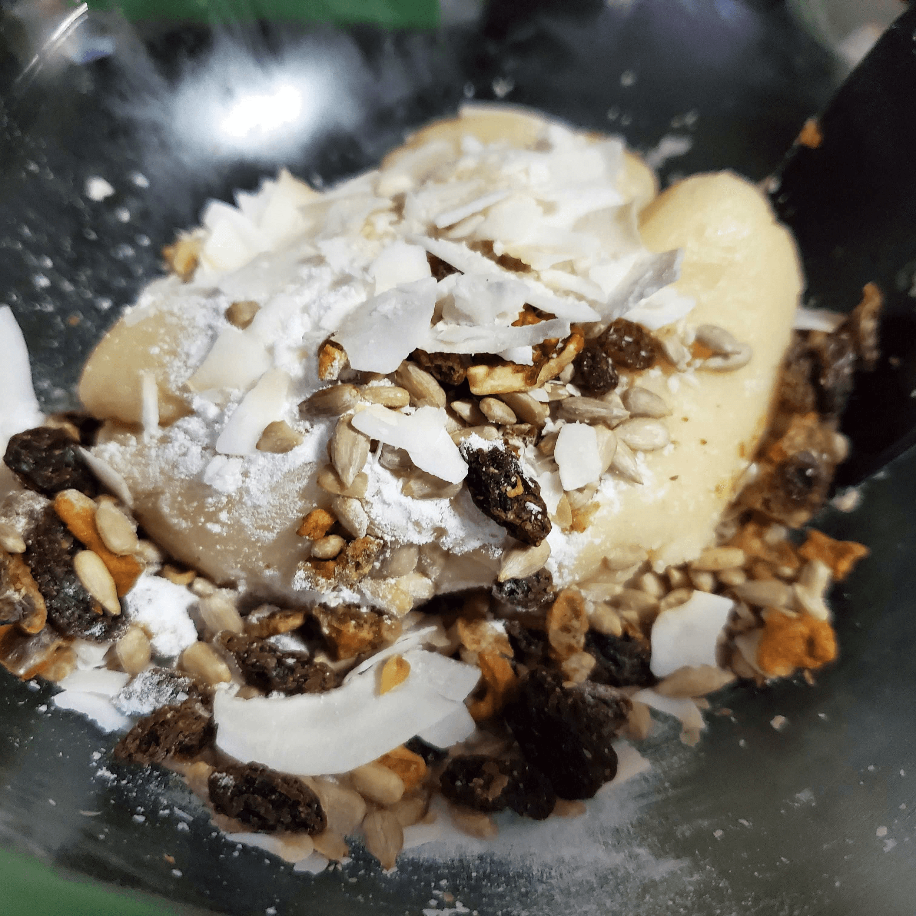 今回はミックスナッツ、ココナッツフレーク、ひまわりの種、レーズン、りんごを加えて焼きました。