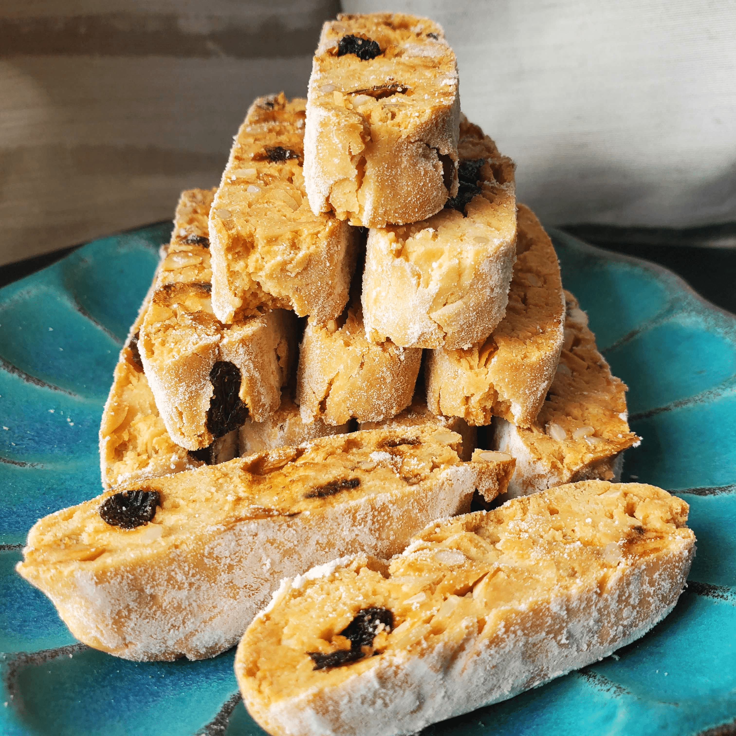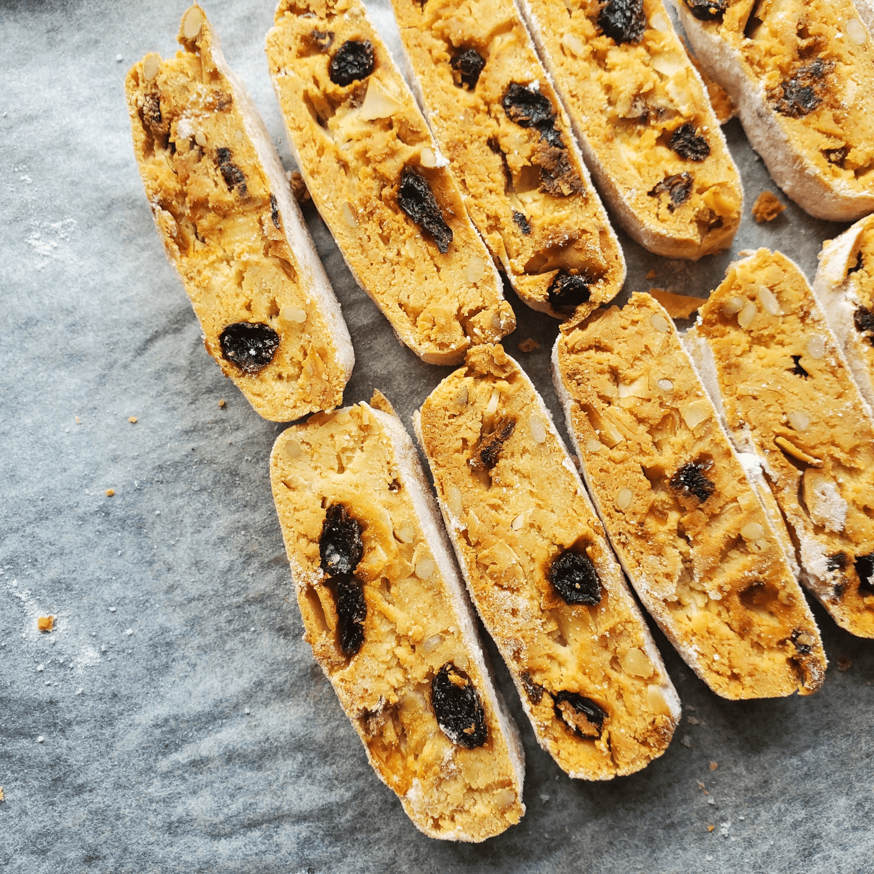ビスコッティは、「2度焼く」という意味があるイタリアの伝統菓子です。通常は小麦粉に卵や砂糖を使いますが、今回はヴィーガン&グルテンフリー仕様ということで、卵や白砂糖はもちろん、小麦粉も使用しません。