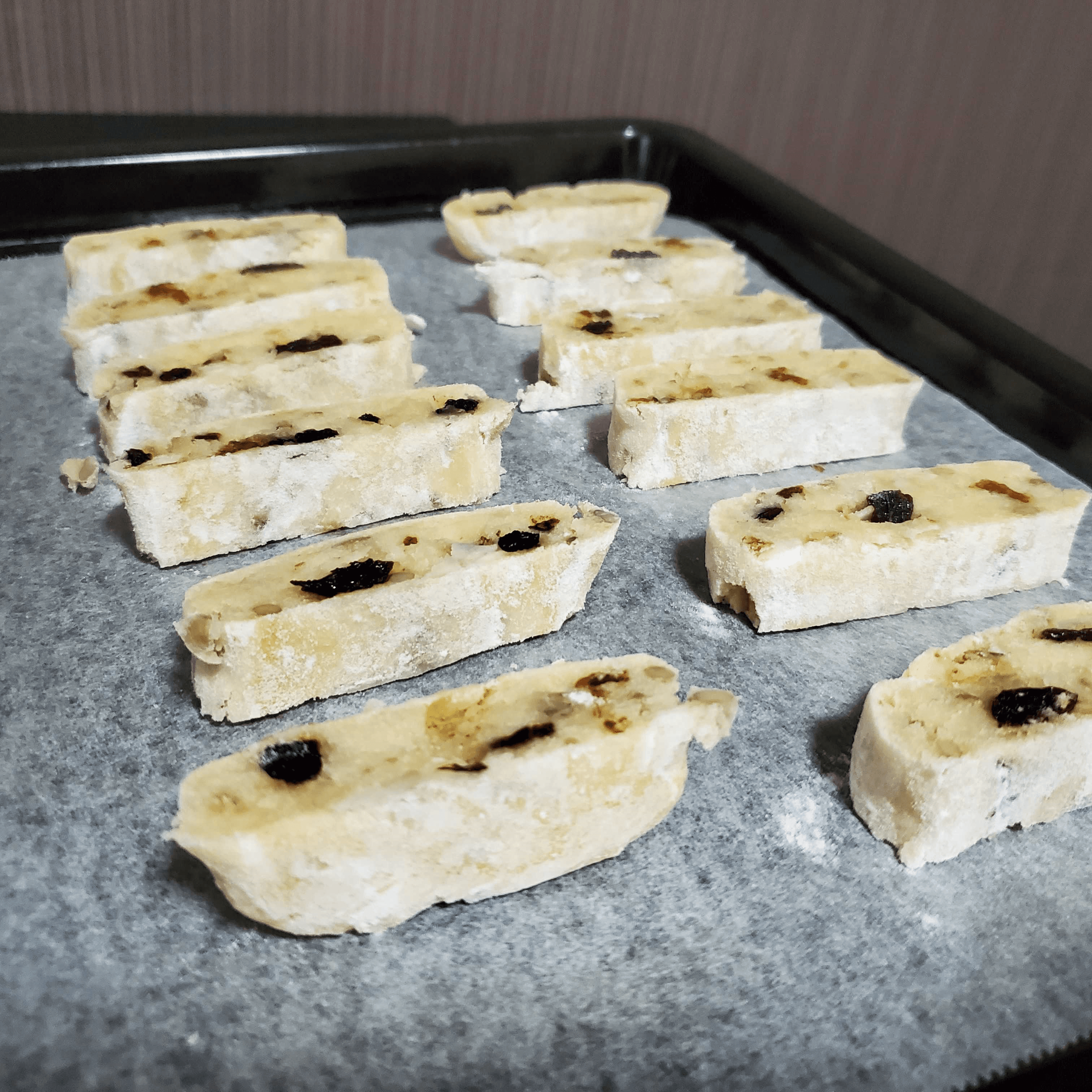 一度取り出し、1.5センチ幅にカットしたら横に倒して鉄板に並べ、160℃で15〜20分焼いていきます。