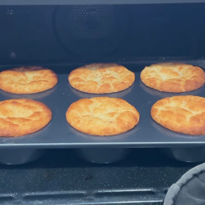 焼けたら乾燥防止にアルミホイルをのせ、完全に冷めたら型から取り出す。(焼きたては崩れたりしぼみやすかったりするので、あまり触らない)