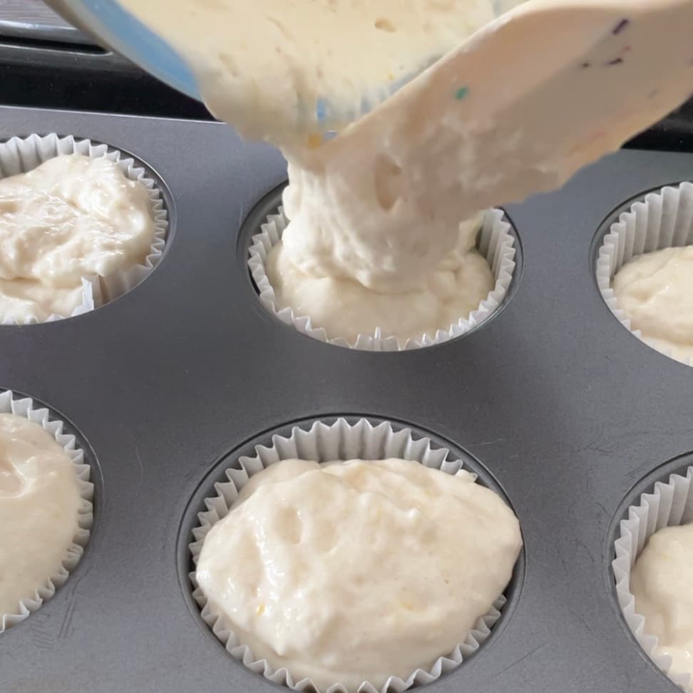 グラシン紙をひいたマフィン型に縁ぎりぎりまで生地を流し込み、すぐにオーブンに入れて180℃で5分、160℃に下げて15分焼く。