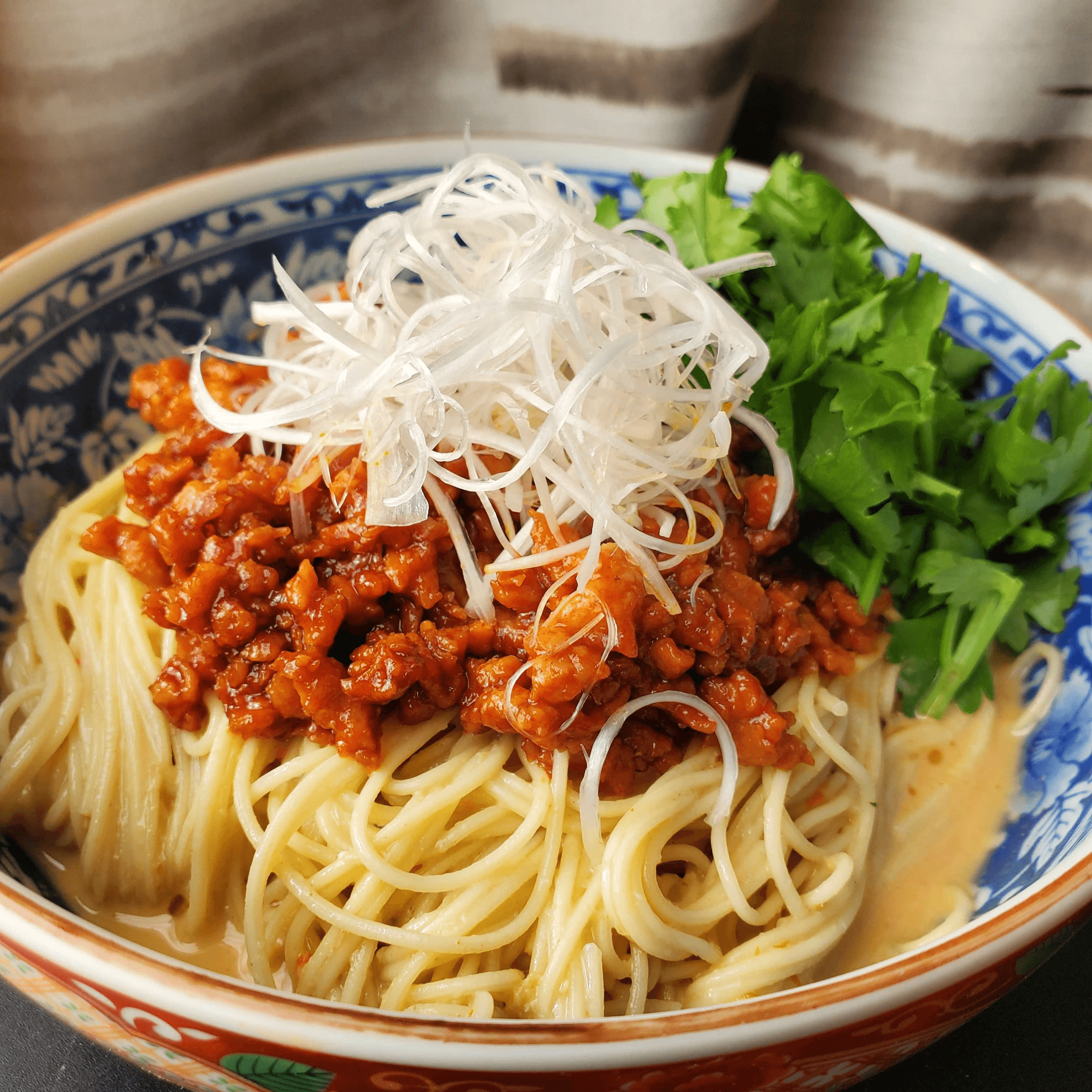 茹でた麺を冷水にとって冷やし、水気を切ったらタレと和えて、肉味噌と具材を乗せたら完成です。