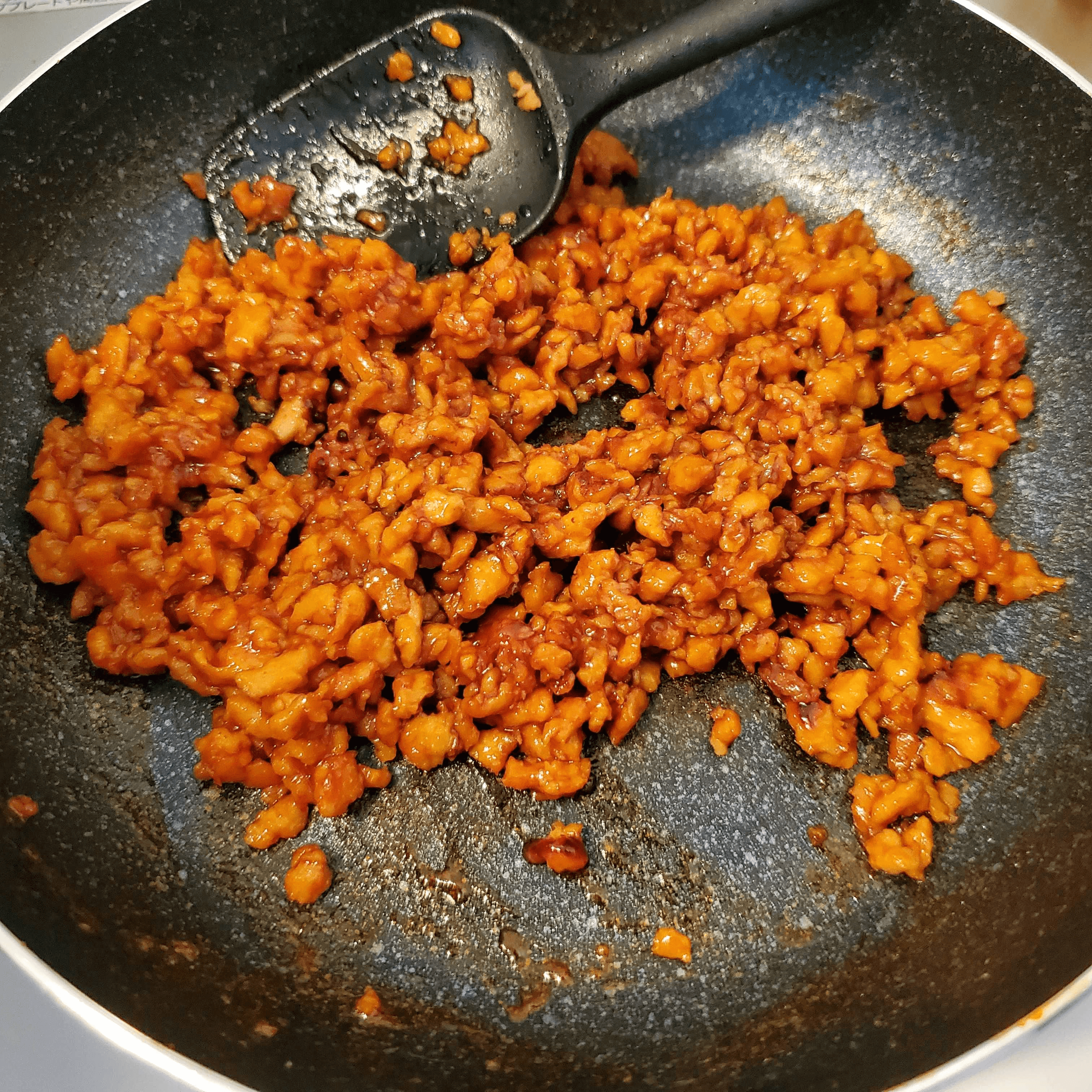 ・肉味噌はキノコやナッツ類、木綿豆腐でも作れます。今回はマルコメの『ダイズラボ 大豆のお肉ミンチ レトルトタイプ』を使用。
