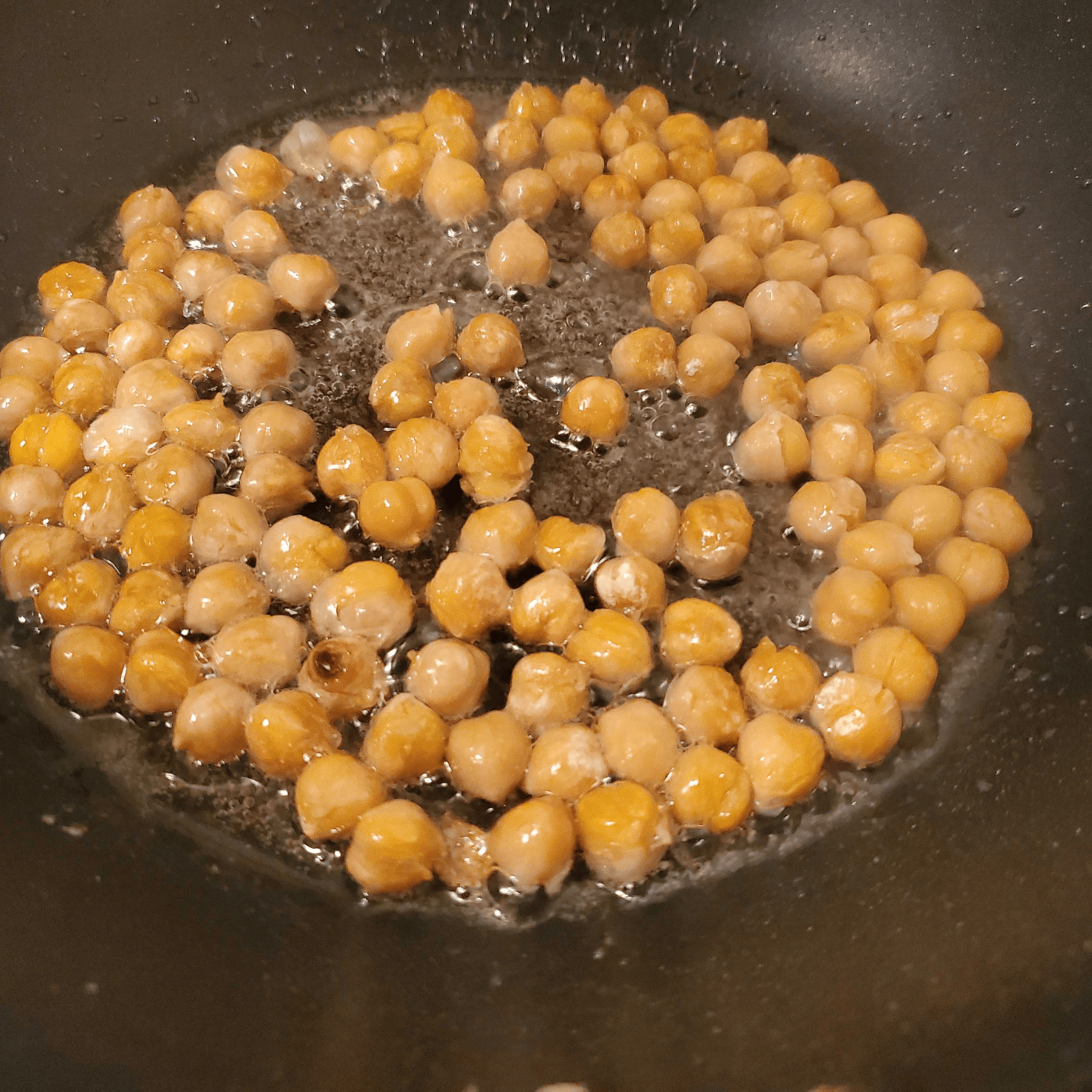 茹でたひよこ豆の水気をペーパーで拭き取り、オリーブオイルを多めに加えたフライパンで揚げ焼きします。