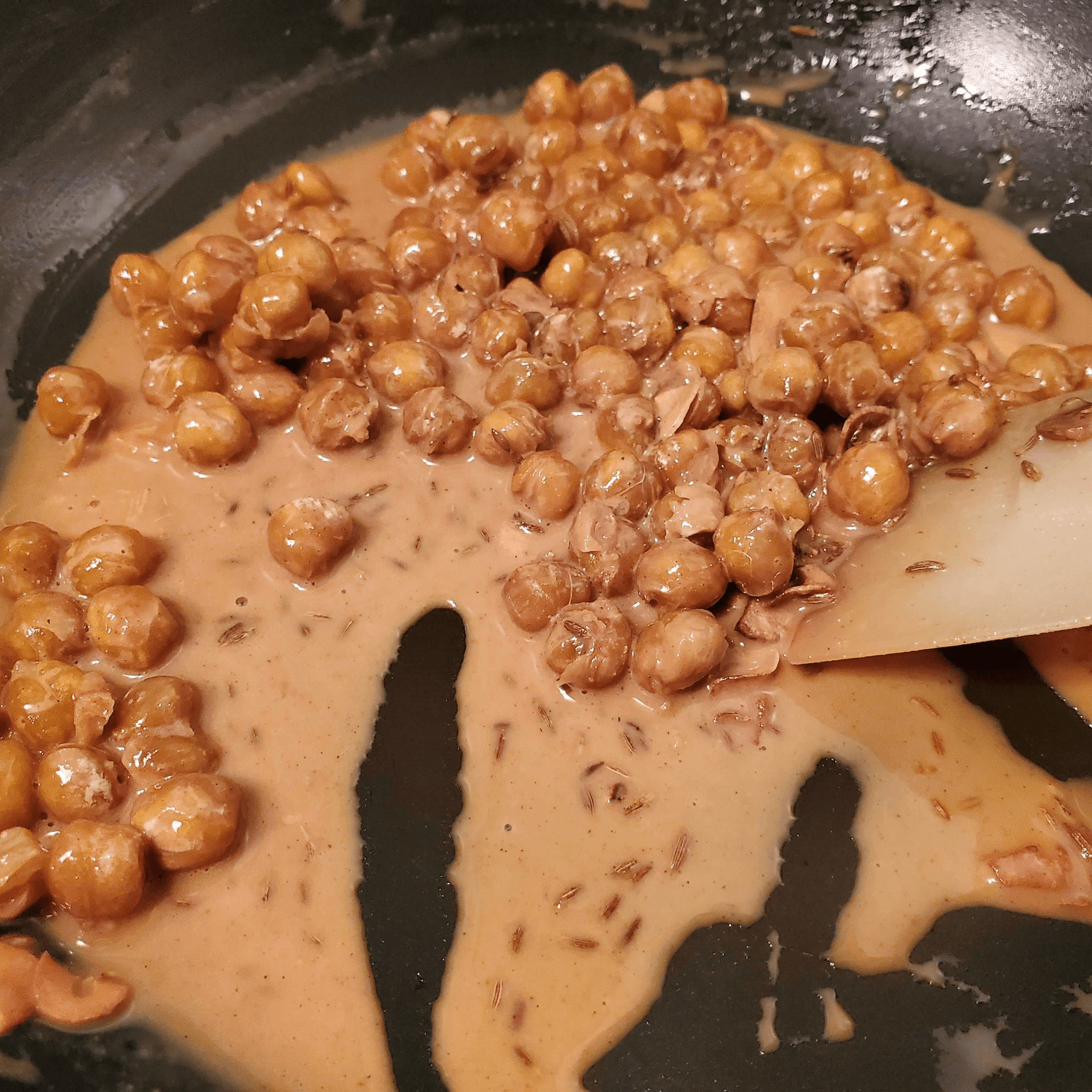ひよこ豆がカリッと揚がったら、ニンニクスライスを加えて同じく揚げていき、余分な油をペーパーで拭き取ってからクミンとタヒニを加えます。