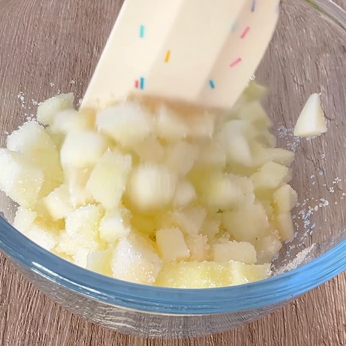 リンゴを1cm弱に角切りし、砂糖・塩をまぶして10分ほど置く。→ 水分が出て、しっとり食感に。