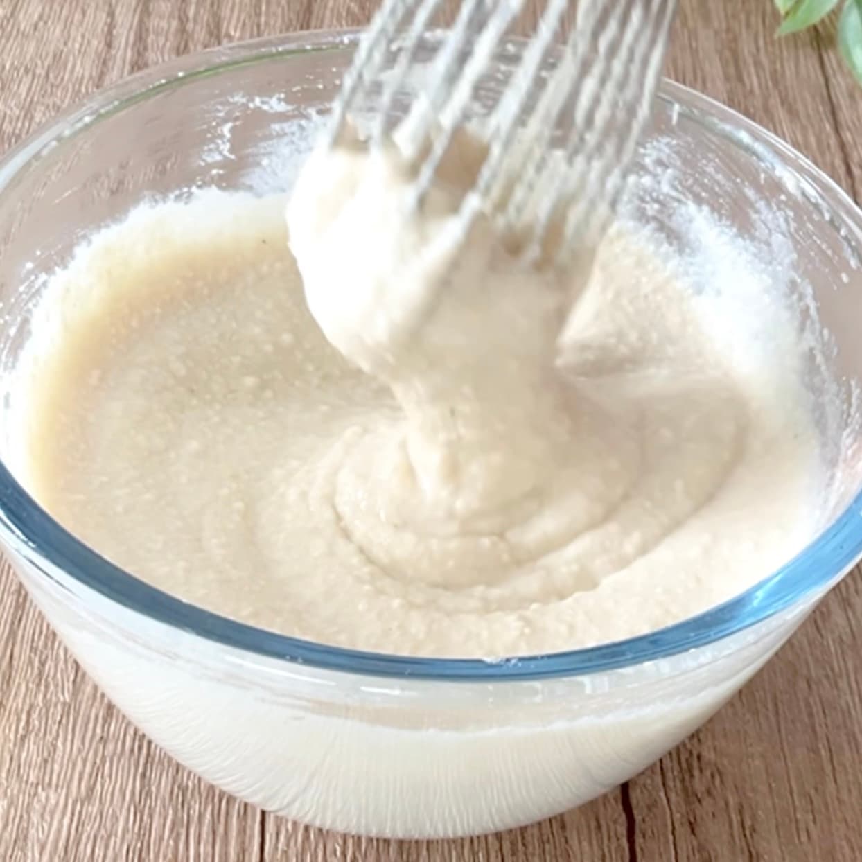 ボウルに豆腐・砂糖・塩を入れ、泡立て器でなめらかになるまで潰す。 植物油を加え、さらに混ぜる。 米粉とシナモンを加えて混ぜ、豆乳を少しずつ加えてなめらかに。
