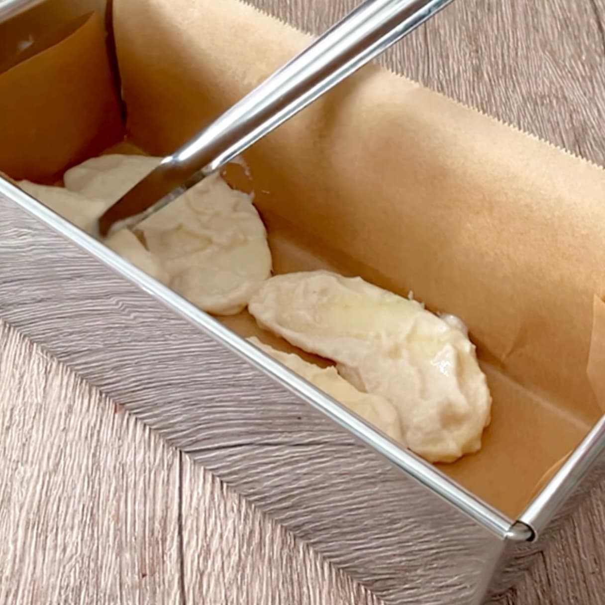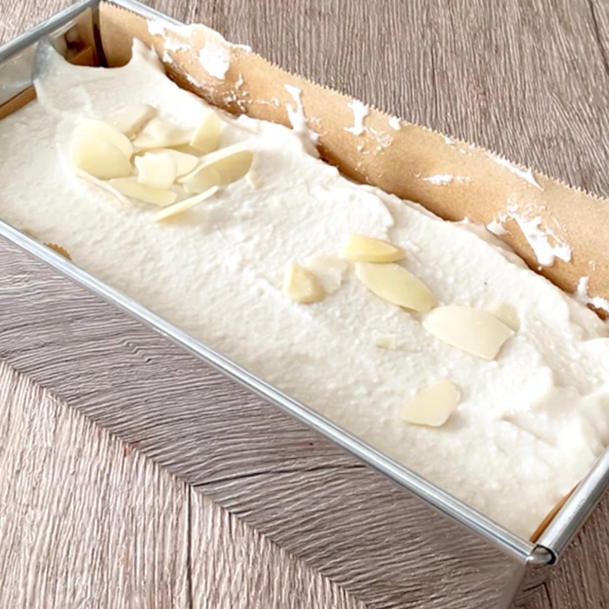 生地にリンゴを加えてやさしく混ぜ、型に一枚ずつ重ねながら入れる。 上から残りの生地を流し込み、スライスアーモンドを散らす。