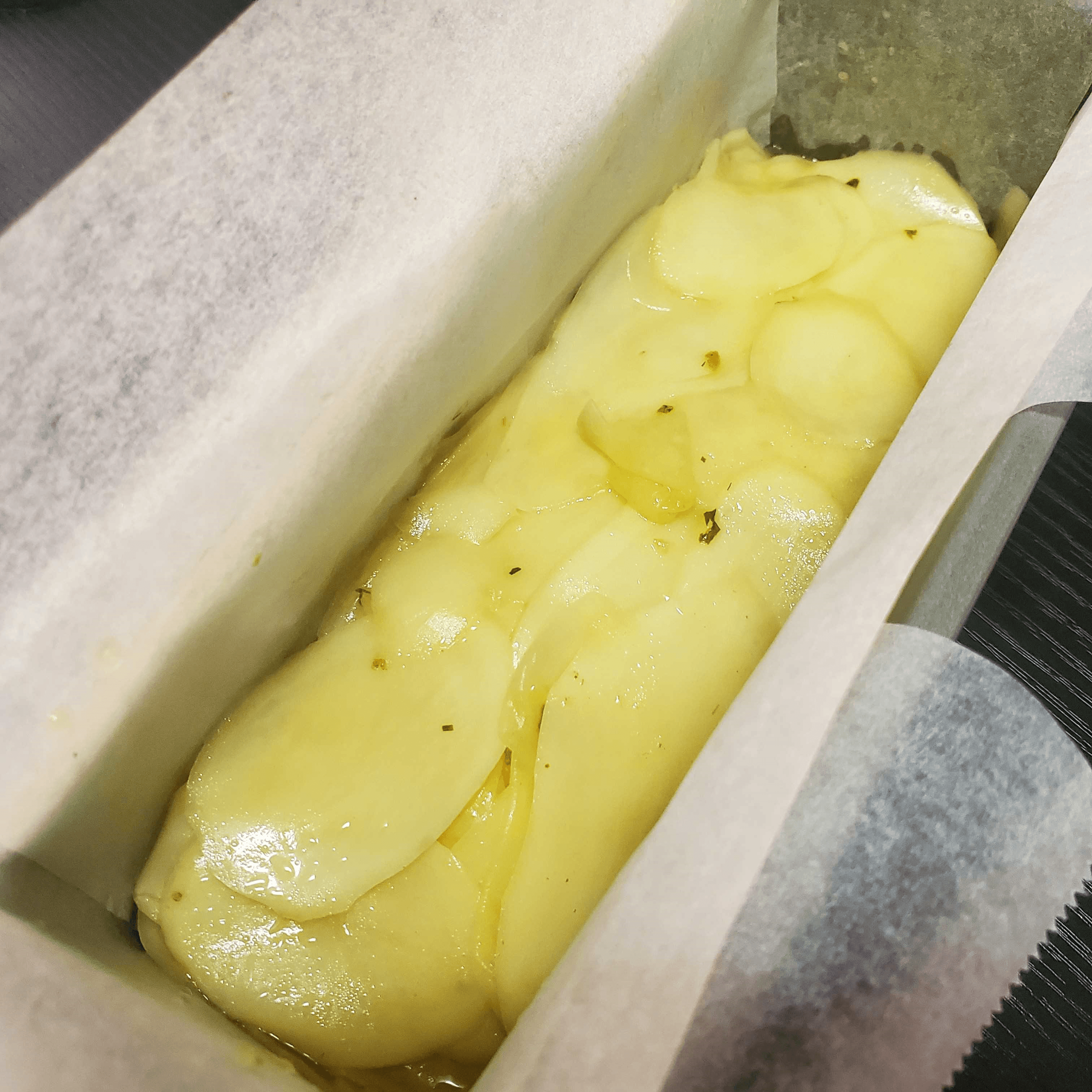 パウンド型にクッキングシートを敷き、1枚ずつ隙間のないようにじゃがいものスライスを敷き詰めます。