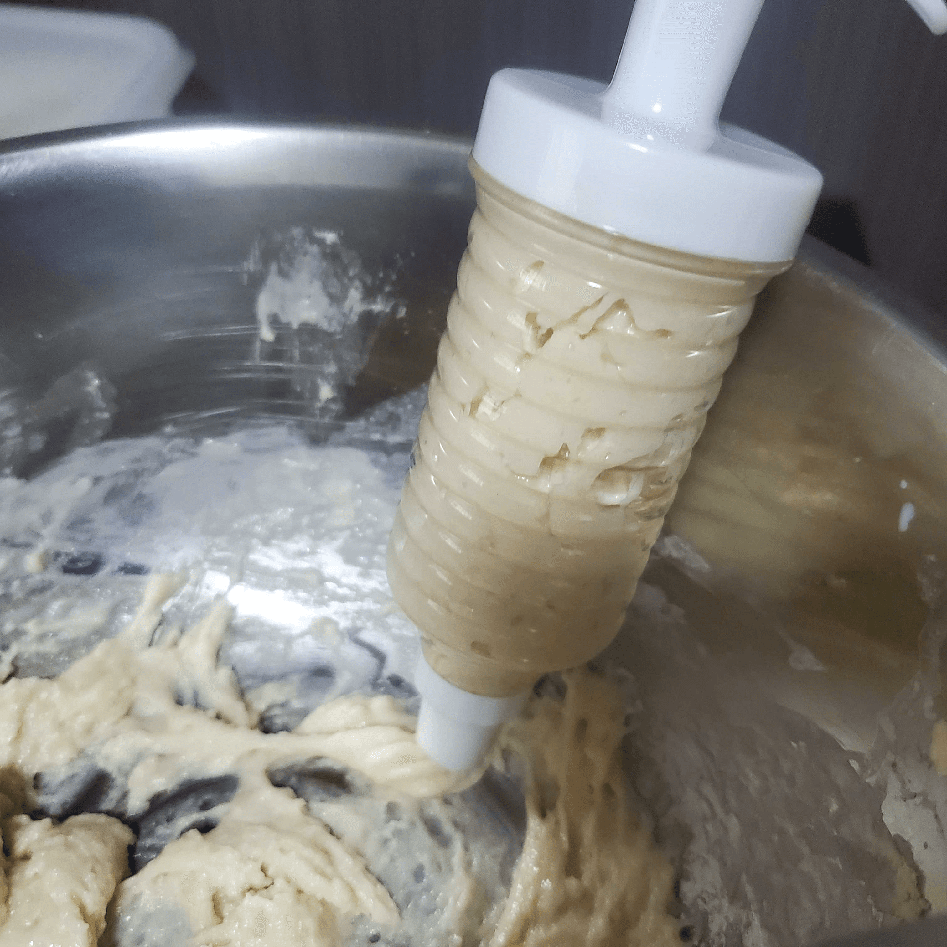 絞り型に入れてボウルの中で試しに絞り出してみます。固ければ豆乳を足して調整します。