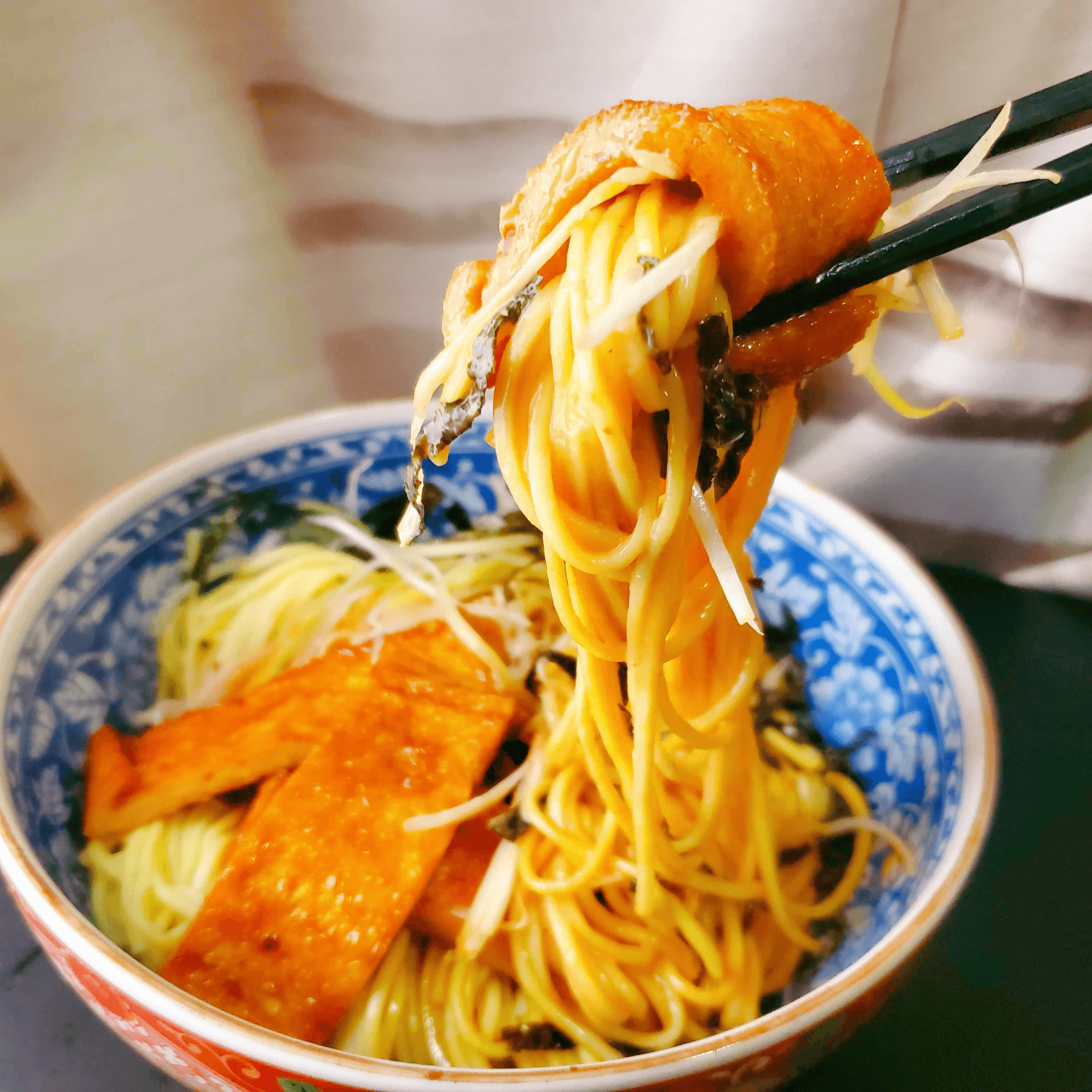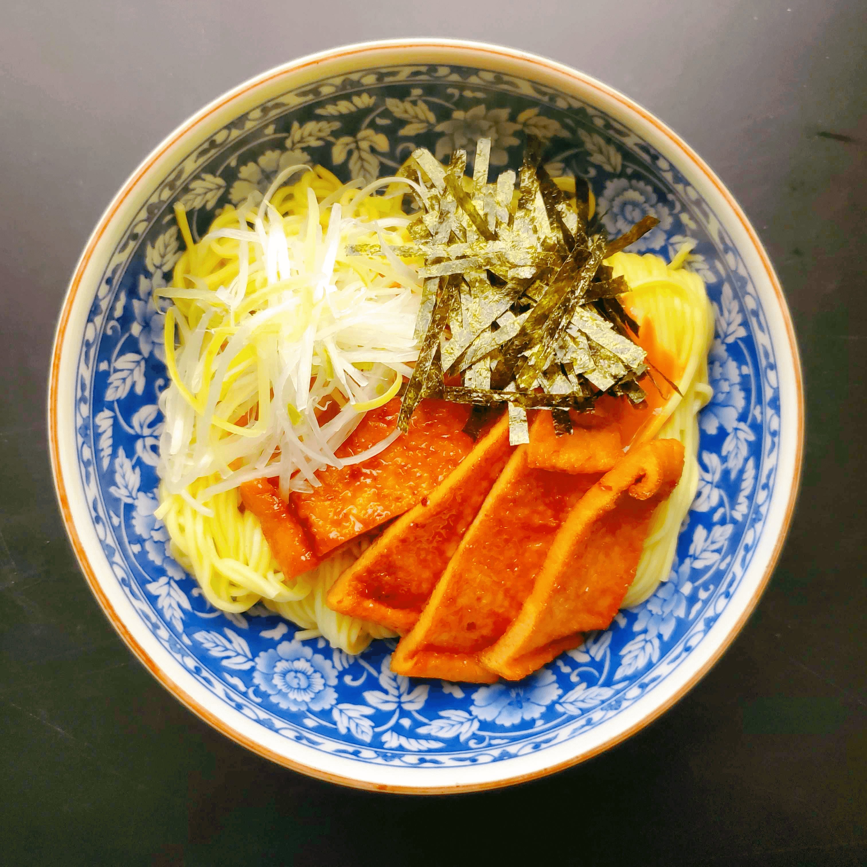 具材は白髪ねぎ、刻み海苔と、醤油、アガベシロップ、かんずりで煮た油揚げをトッピングしました。最後にラー油やいりごまなどを振っても美味しいです。
