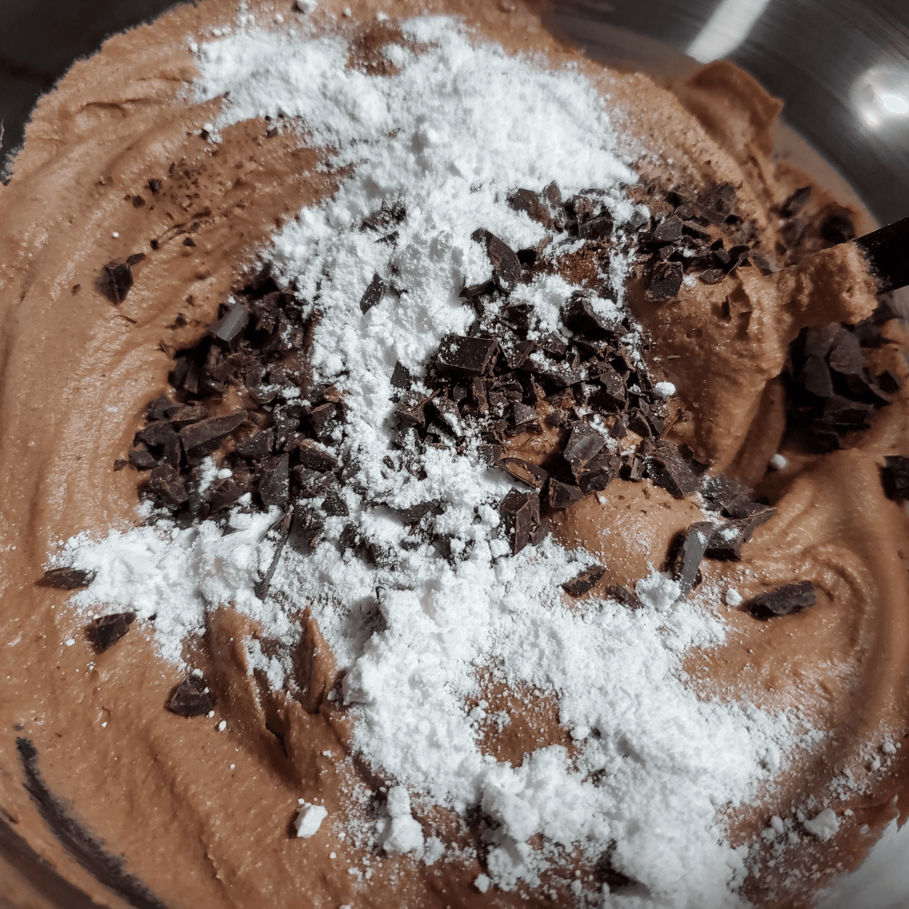 冷やした生地にベーキングパウダーと刻んだカカオマスを加えて混ぜます。