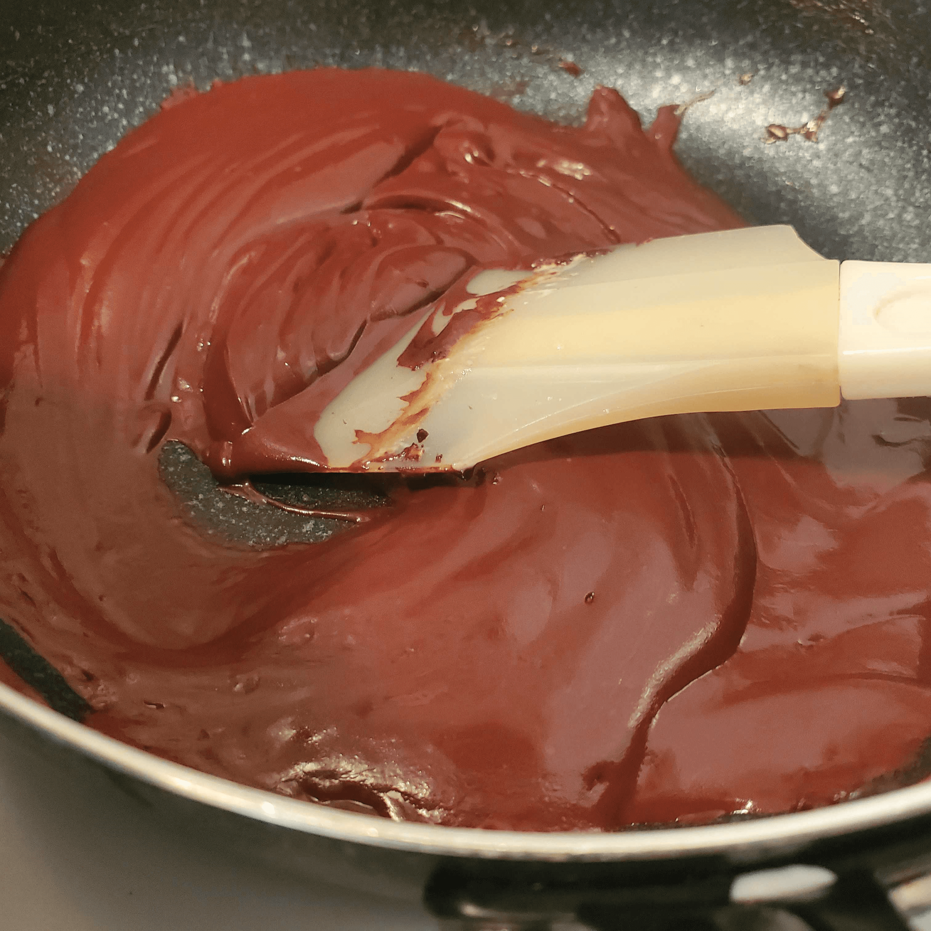 チョコを温めて溶かしたら火を止めて、ココナッツミルクを少しずつ加えながら混ぜ合わせます。