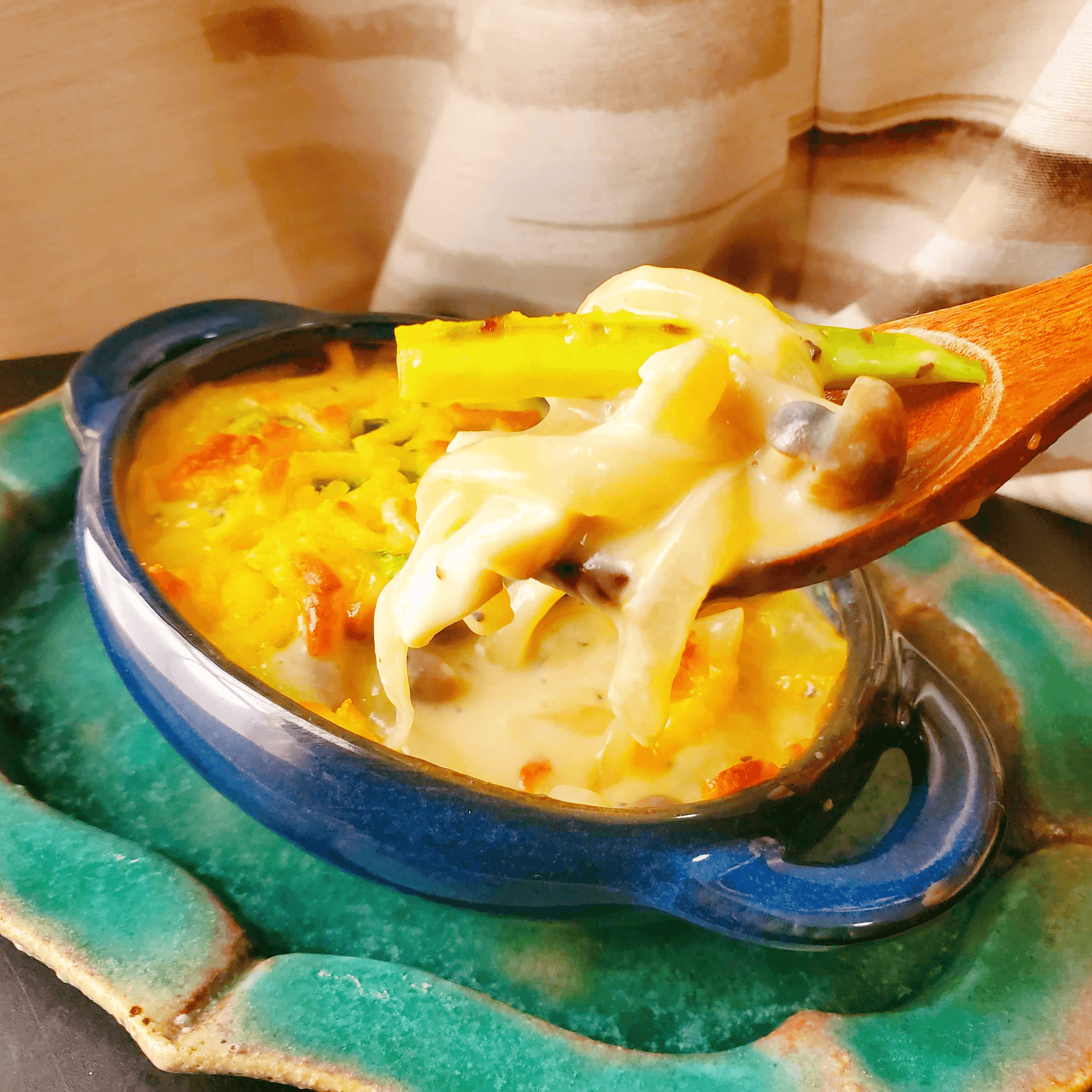 春野菜「アスパラ」と「新玉ねぎ」を使ったヴィーガングラタンの作り方をご紹介します。(17センチグラタン皿2〜3人前)