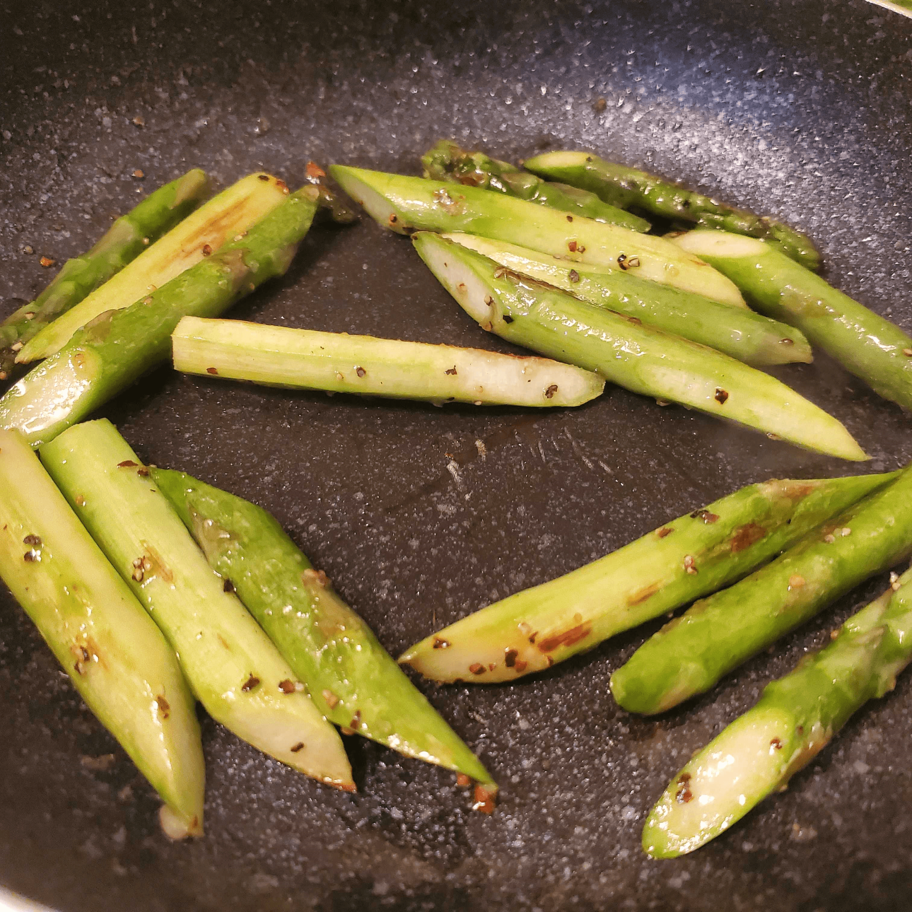 アスパラ1本を3等分にカットして、別のフライパンにオリーブオイルを加えて焼き、塩コショウを振ります。