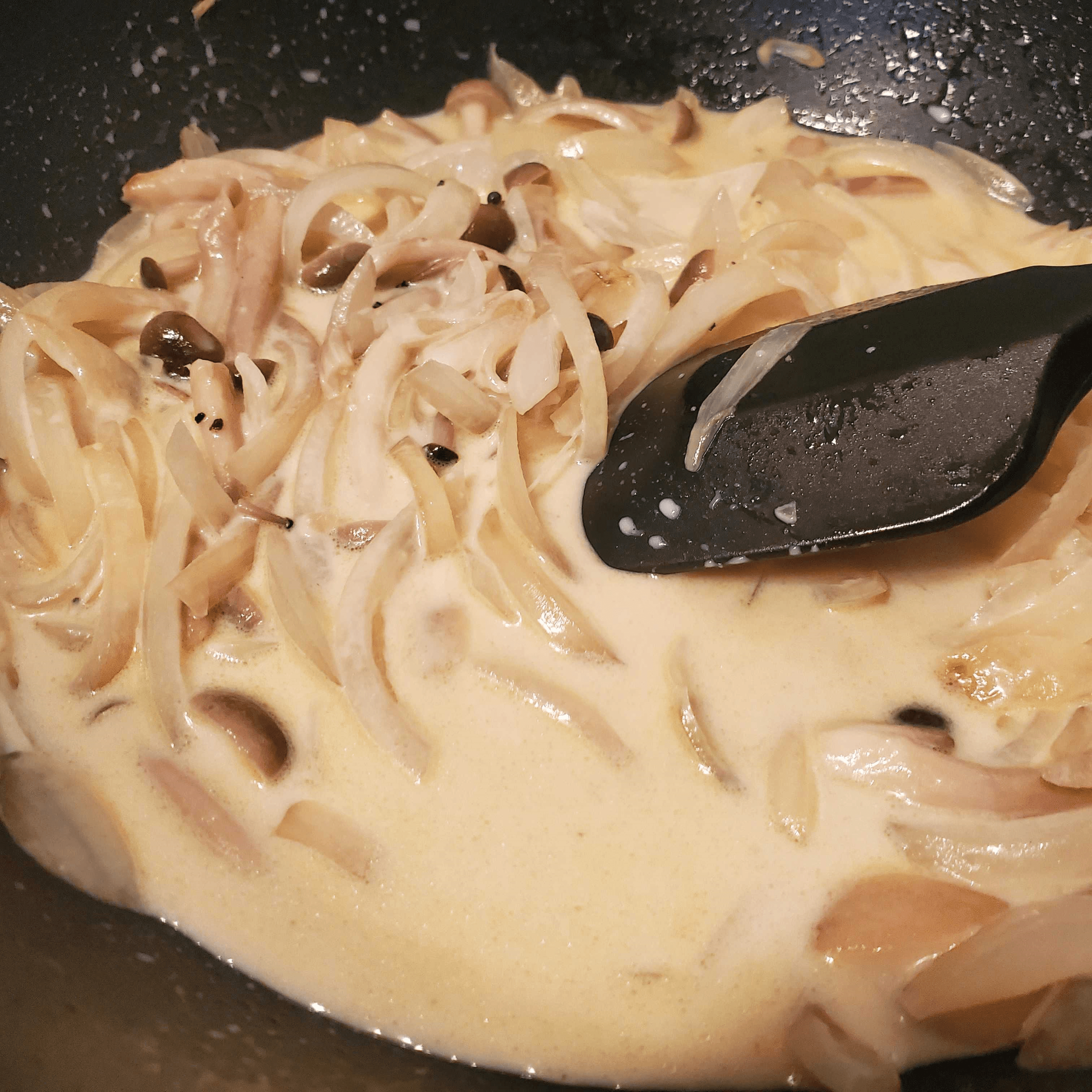 豆乳にみそと米粉を加えてよく溶き、玉ねぎ、しめじを炒めたフライパンに加えます。とろみが付くまで火にかけて、味見をして足りなければ塩をします。