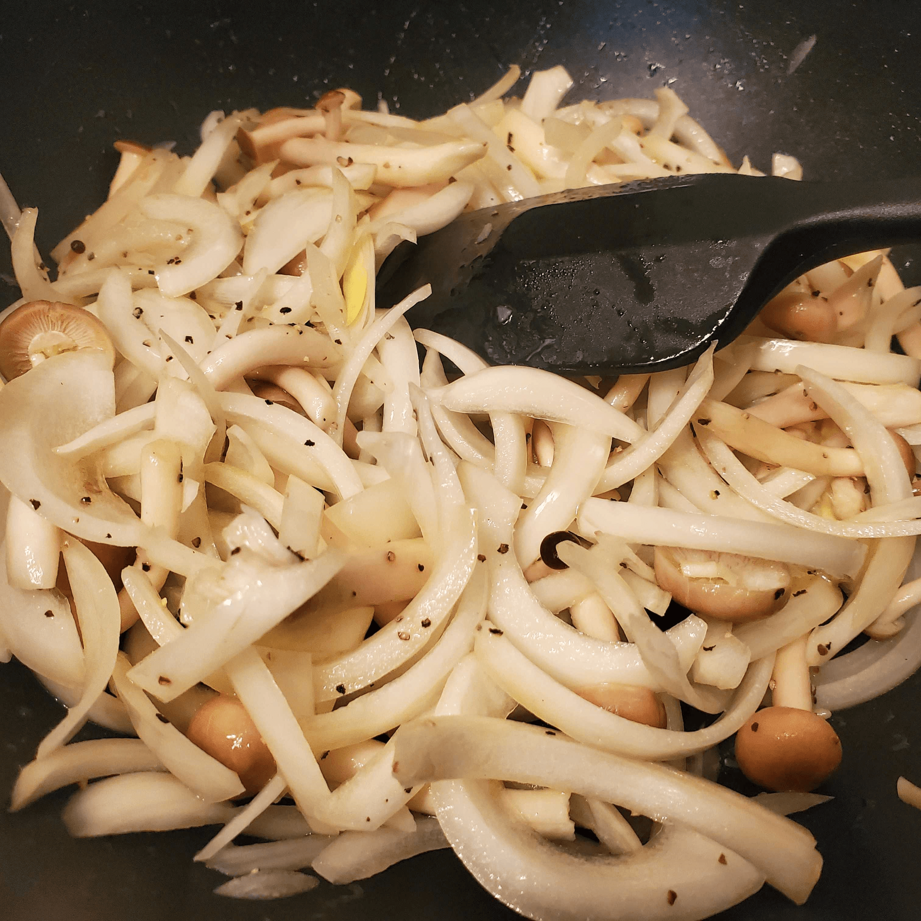 分量のオリーブオイルで玉ねぎ、しめじを炒めます。塩コショウで下味をつけておきます。