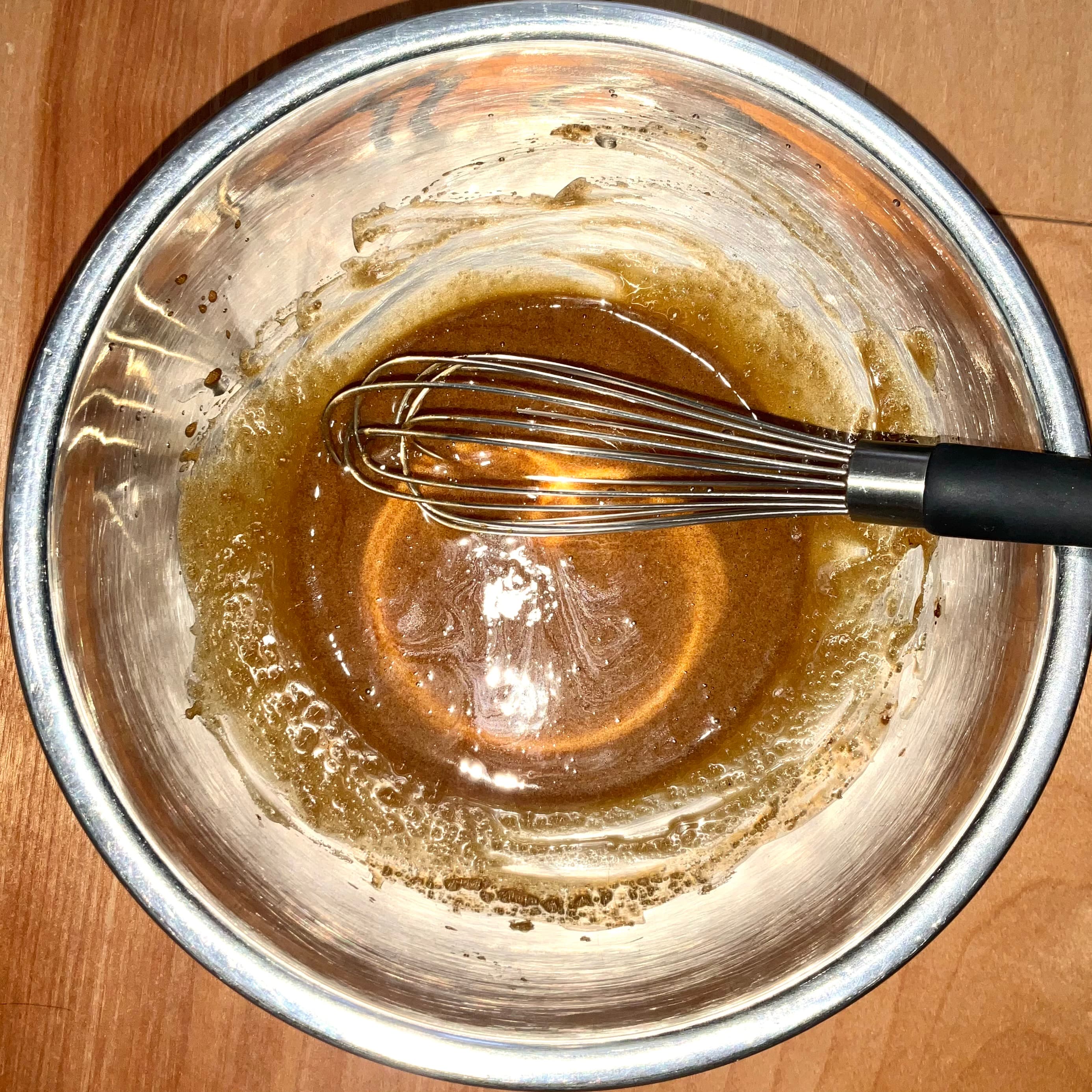2で豆乳と植物油をしっかり乳化させることで、サクッとした食感に仕上がります。油浮きがなくなってマヨネーズ状になるまでしっかり混ぜてから、粉類を加えてください。