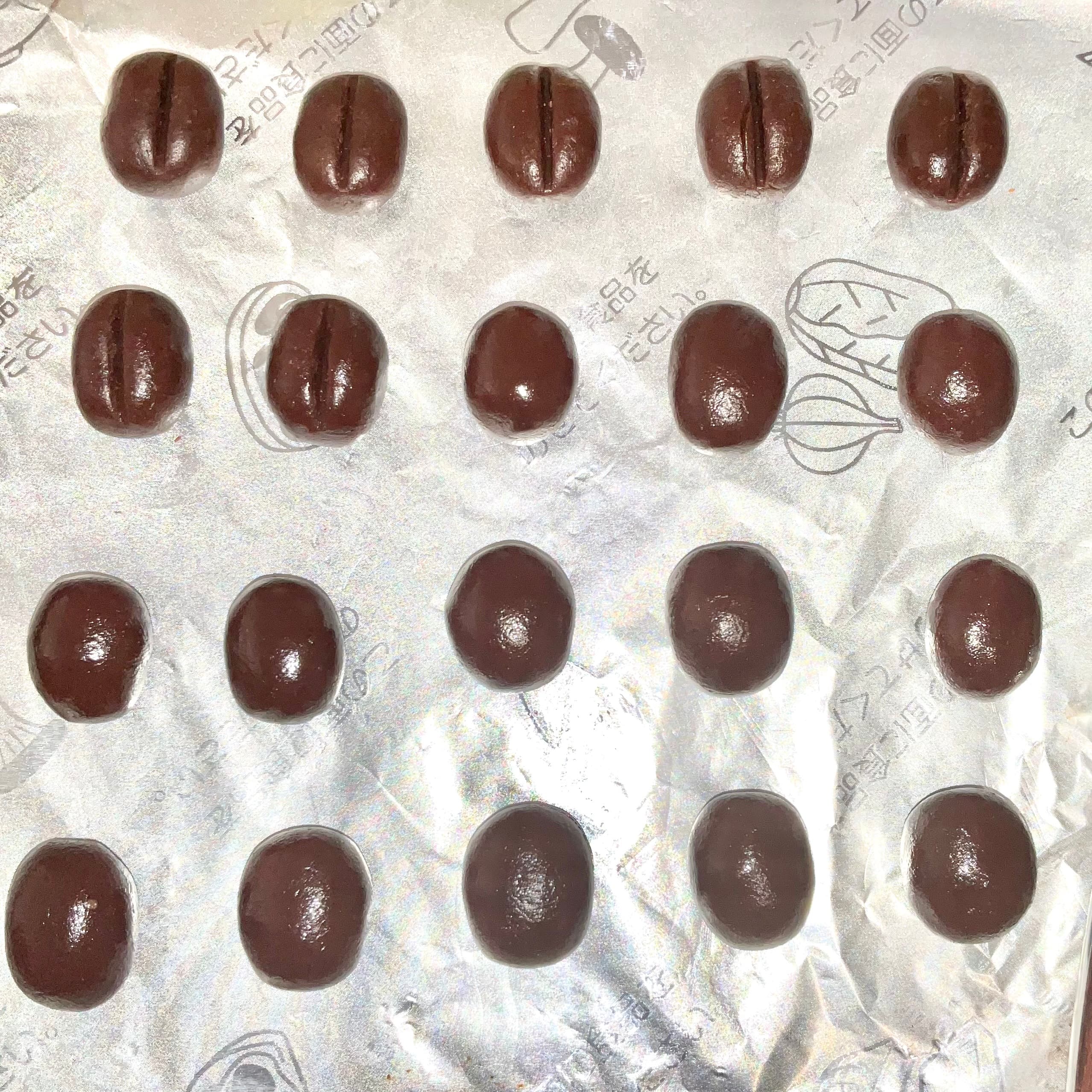 直径2cmの楕円形に丸め、真ん中にナイフの背を押し当ててコーヒー豆形にする。