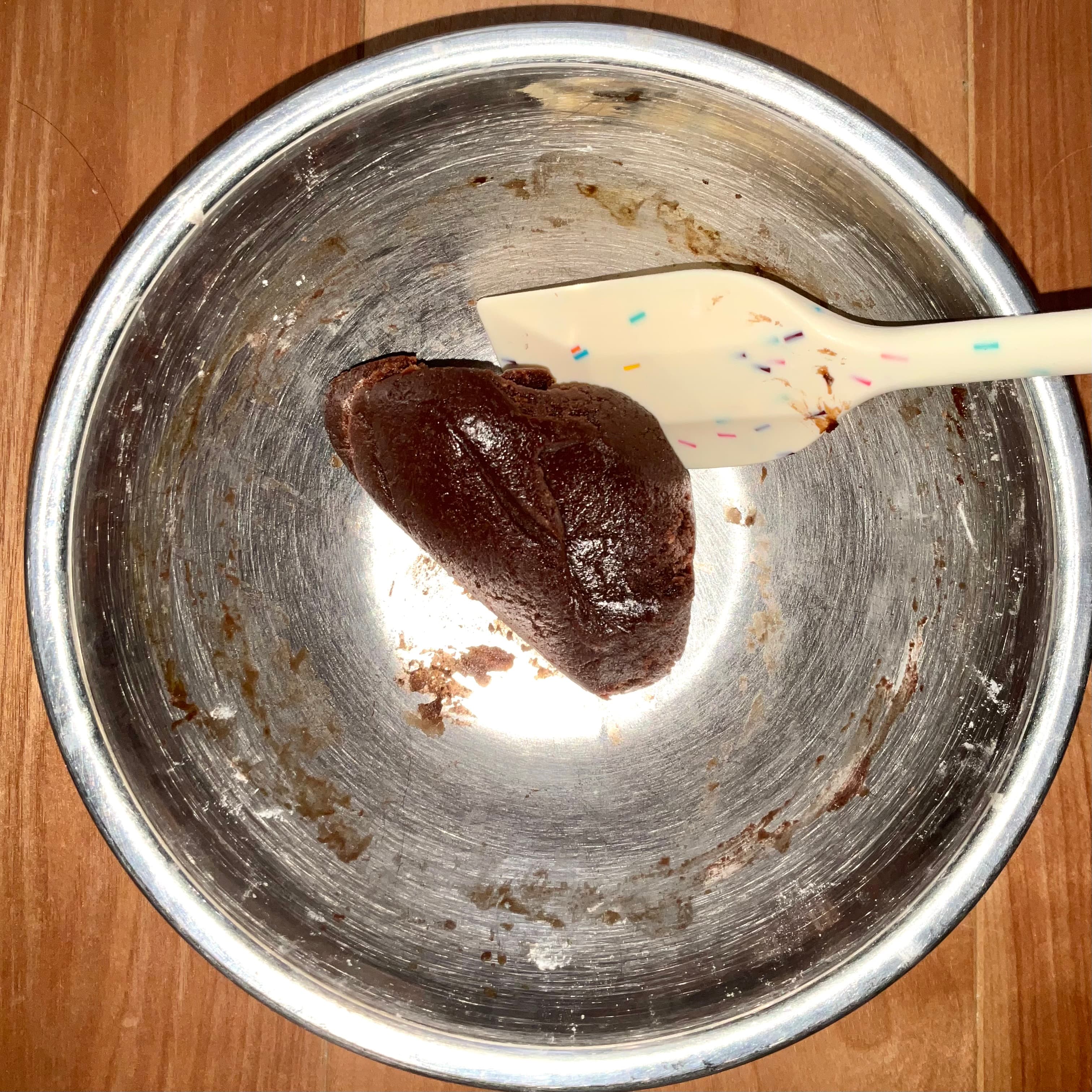 植物油を加えてもったりするまでしっかりかき混ぜたら、残りの粉類を加えひとかたまりにまとまるまでよく混ぜる。