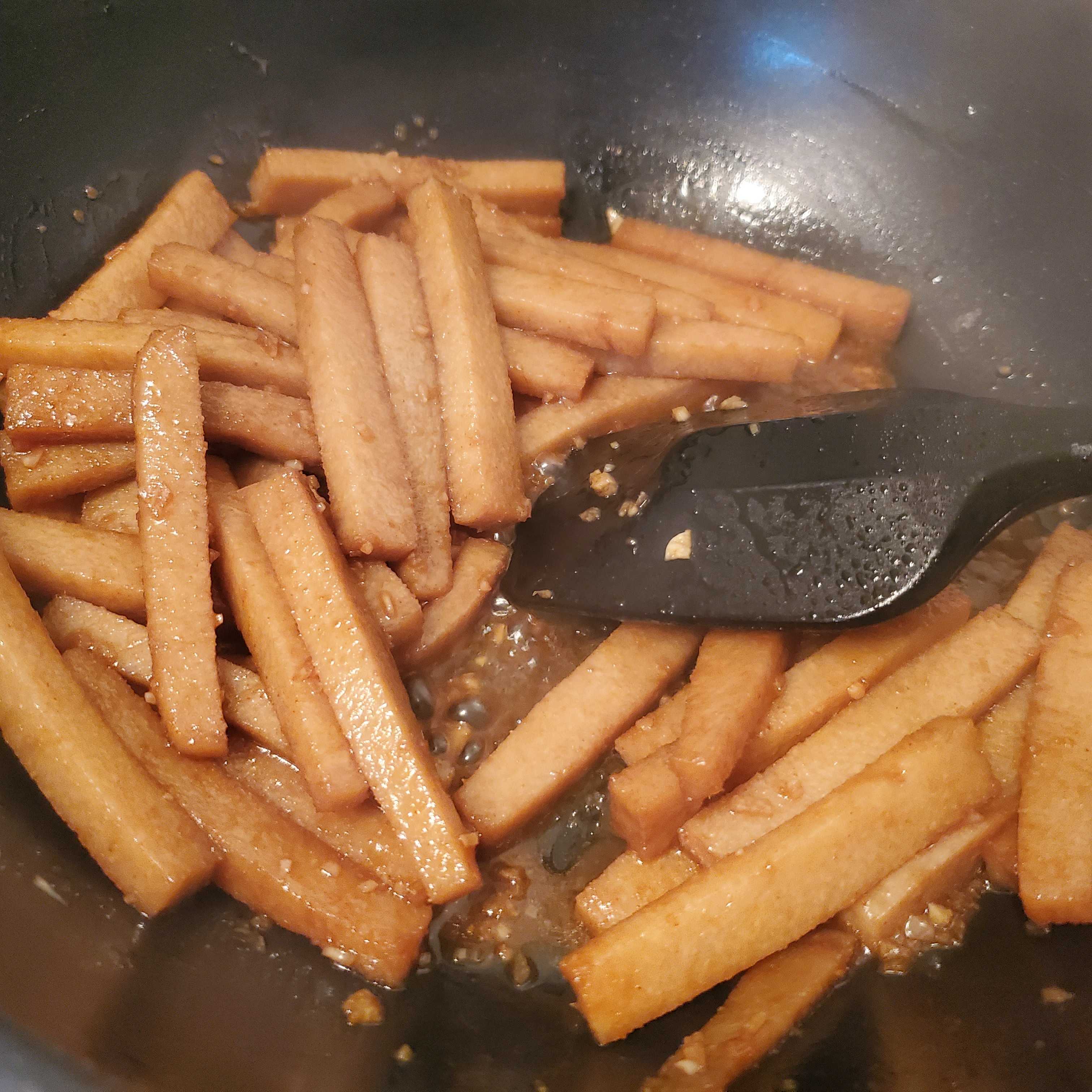 おからこんにゃくを横3等分、縦に細切りしたら にんにくとごま油で炒め、その他の調味料をすべて加えて絡めます。