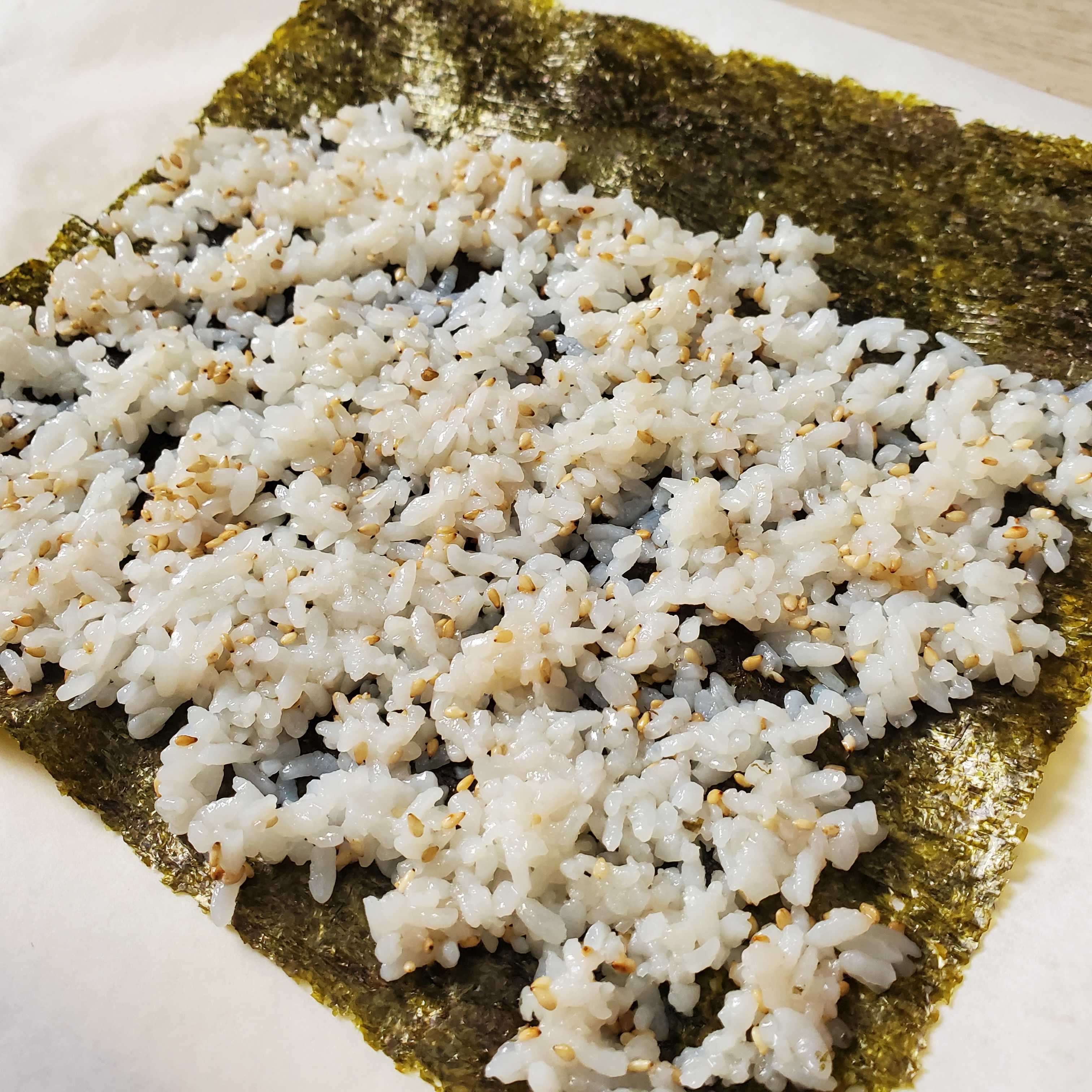 クッキングシート(お持ちの方は巻きす)の上に海苔を置き、ご飯にごま油と塩、いりごまを混ぜて海苔の上に薄く盛ります。