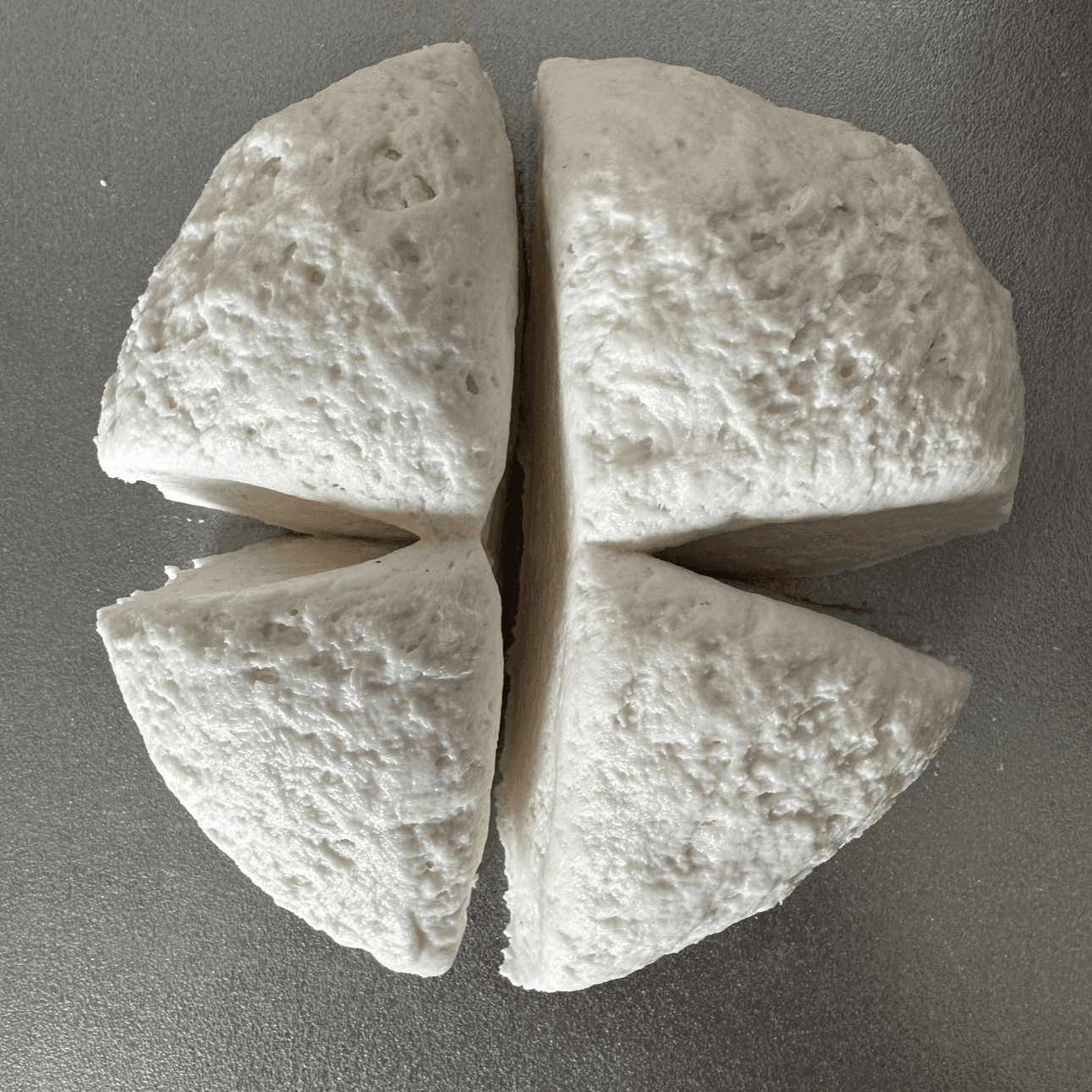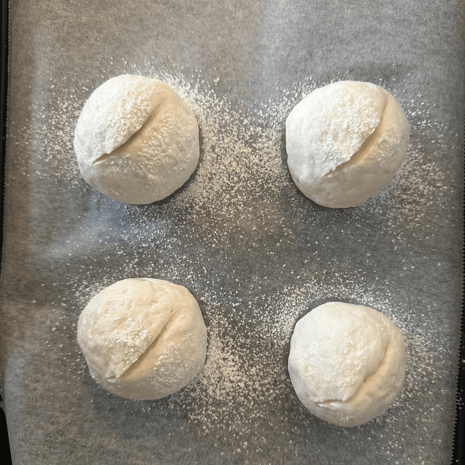 発酵完了した生地をソフトに取り出してスケッパー等で4分割して丸める。