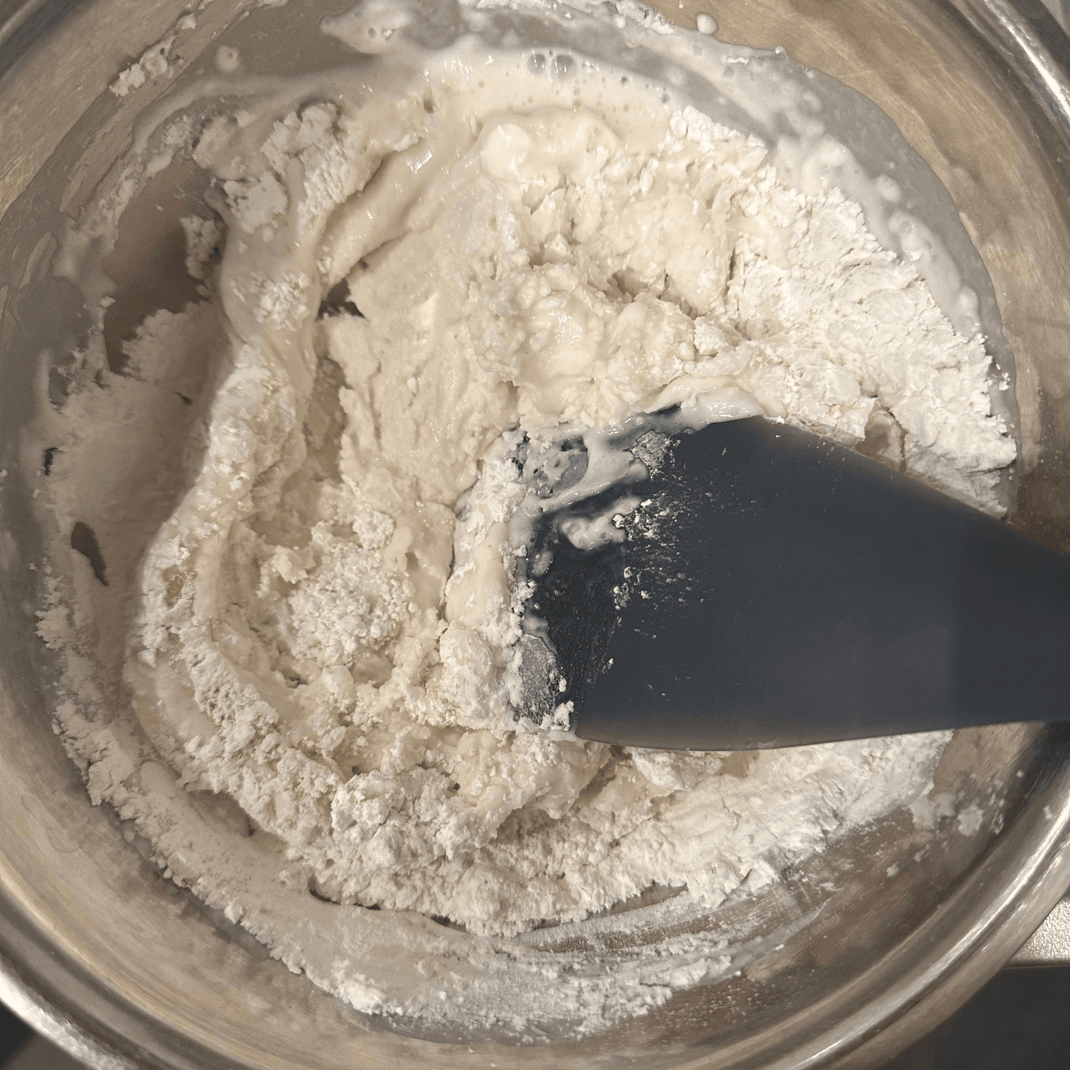 水を加え、ゴムベラでボウルに押し付けるようにして3分程捏ねる(生地はゴムベラにはつかず、指で押すとペタっとつく程度で弾力がある状態)