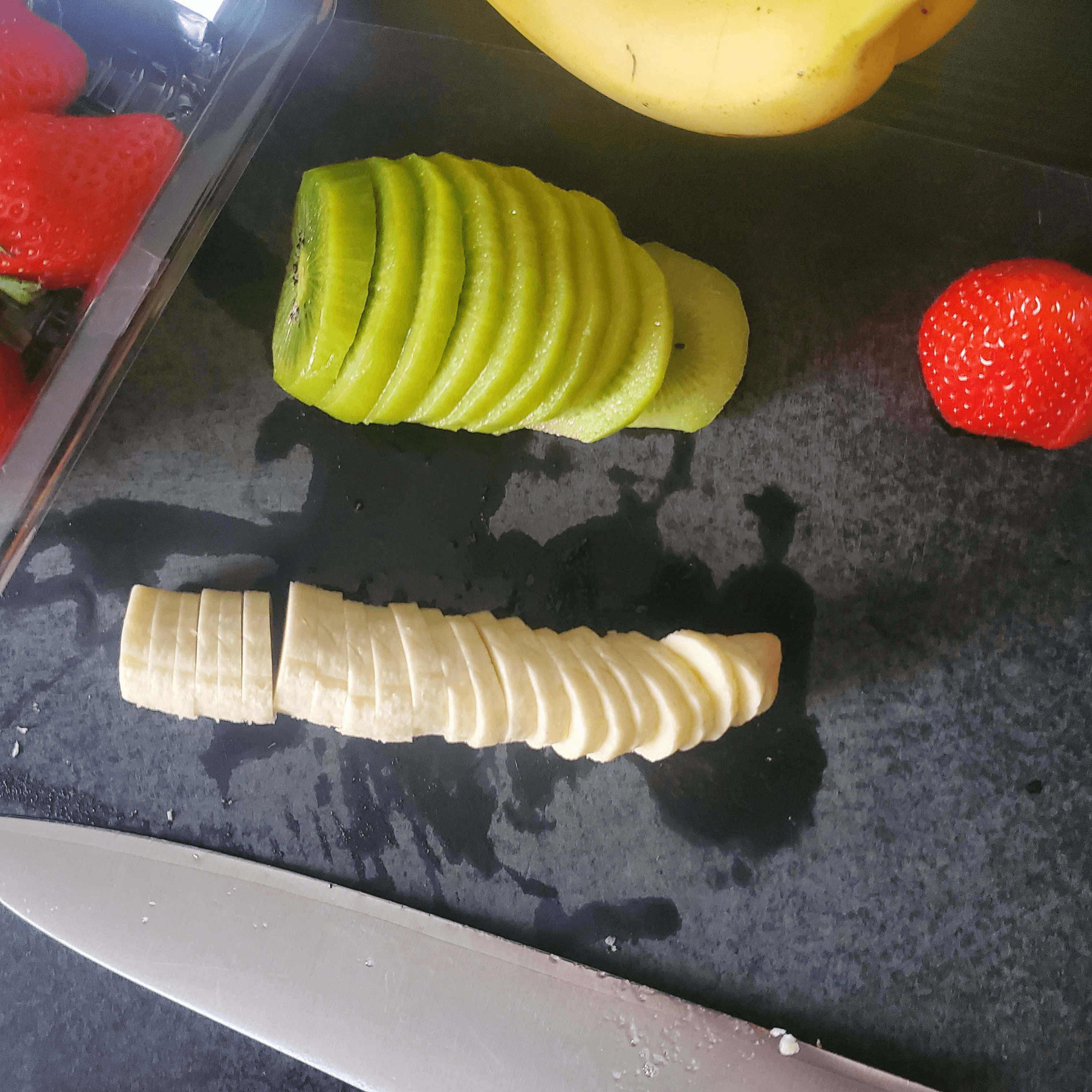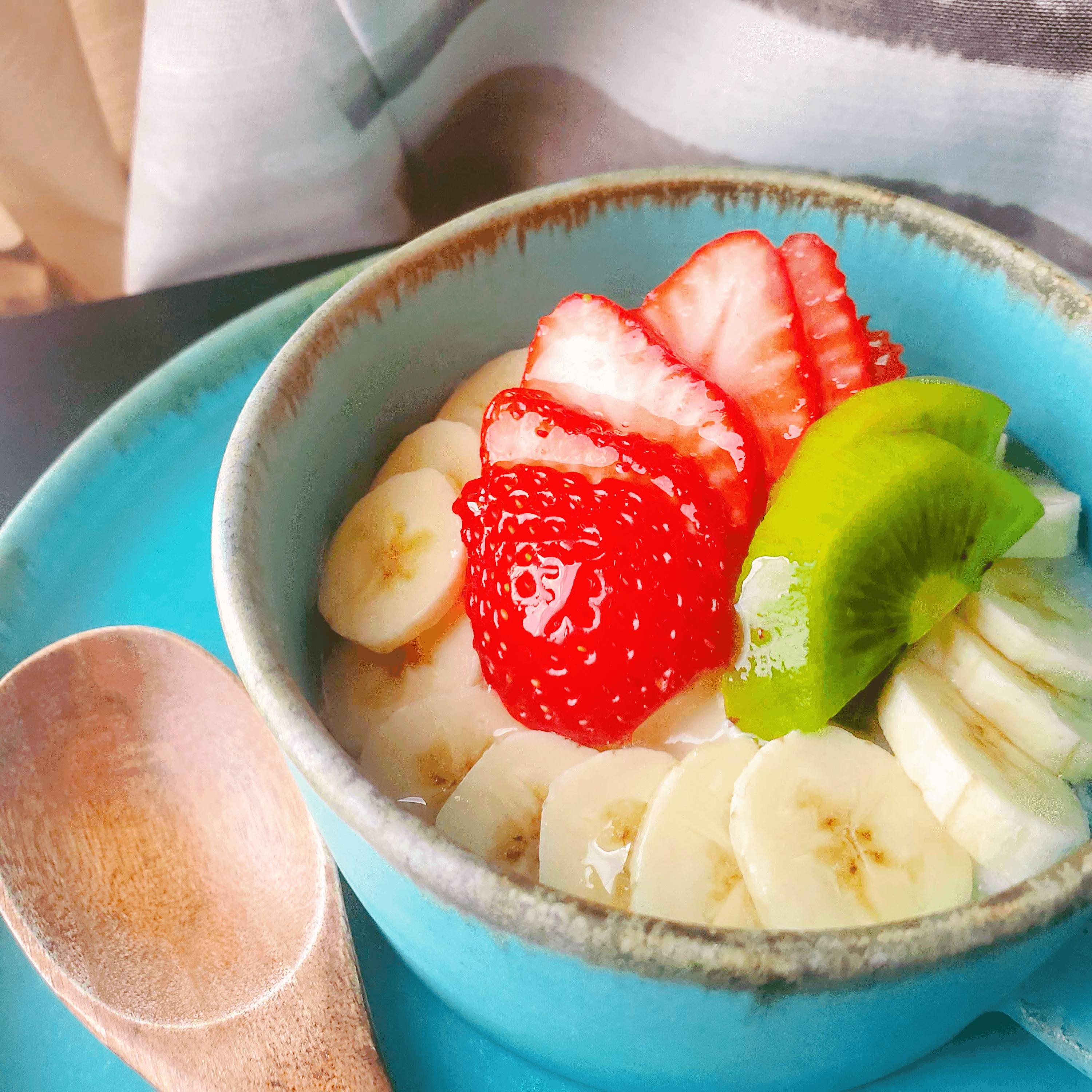 ヨーグルトを盛った器にフルーツを盛り付け、お好みでアガベシロップをかけて完成です。