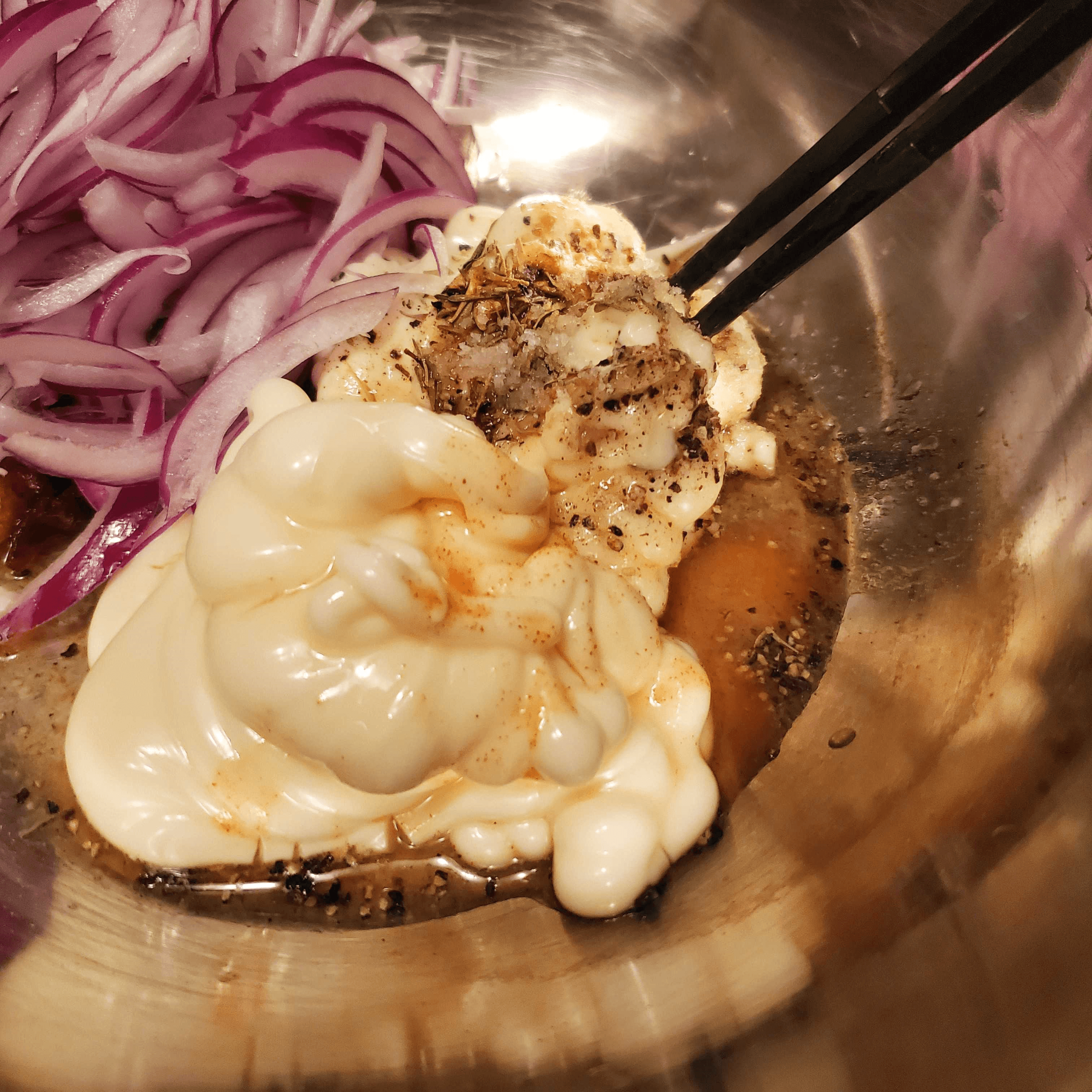 マヨネーズの塩分濃度はメーカーによって違います。ミックスナッツも有塩無塩により、オリーブも塩漬けかオイル漬けかにより、味のバランスが変わるので、最後の塩コショウの量で味を調整してください。