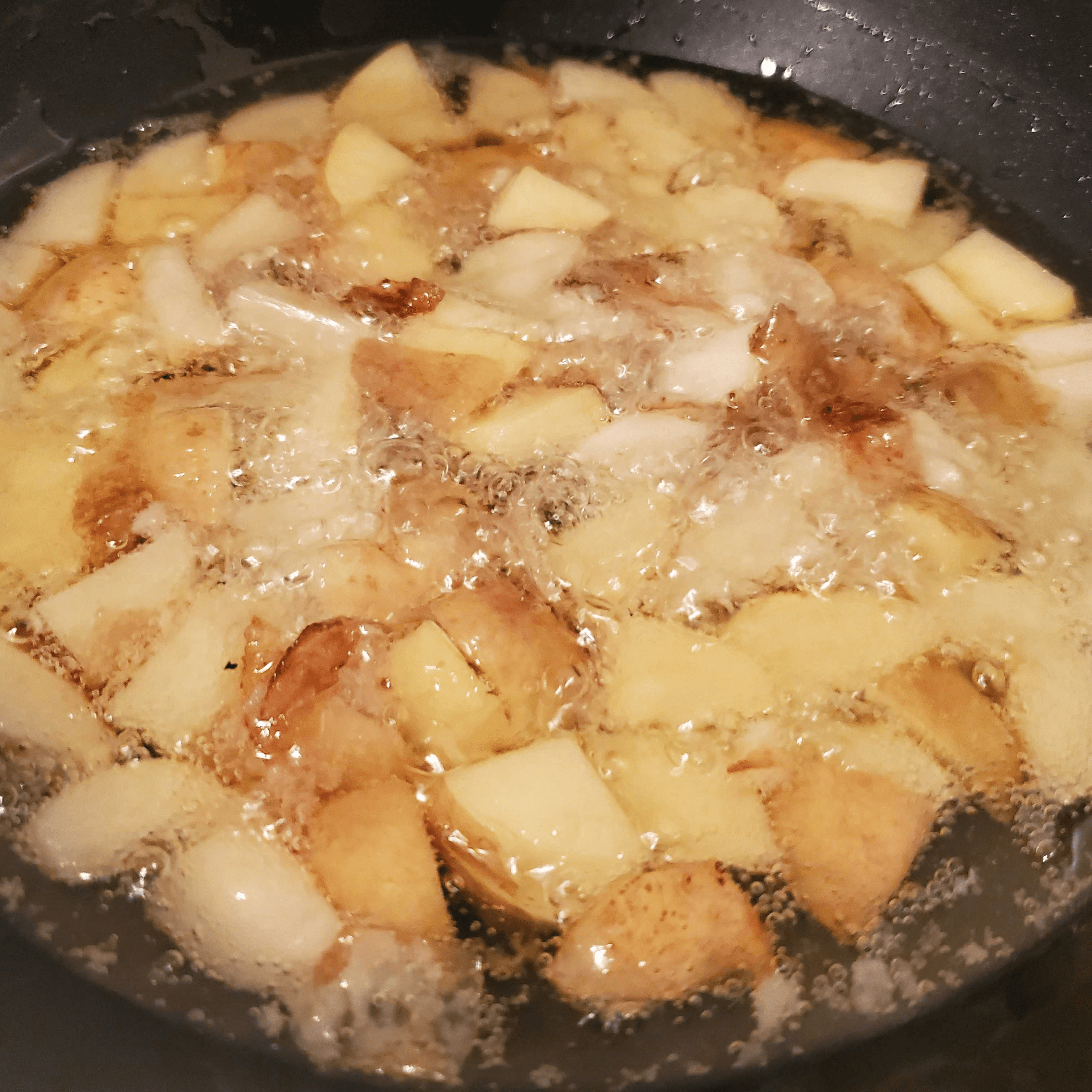 - ジャガイモを大きめのダイスカットにして油で揚げます。