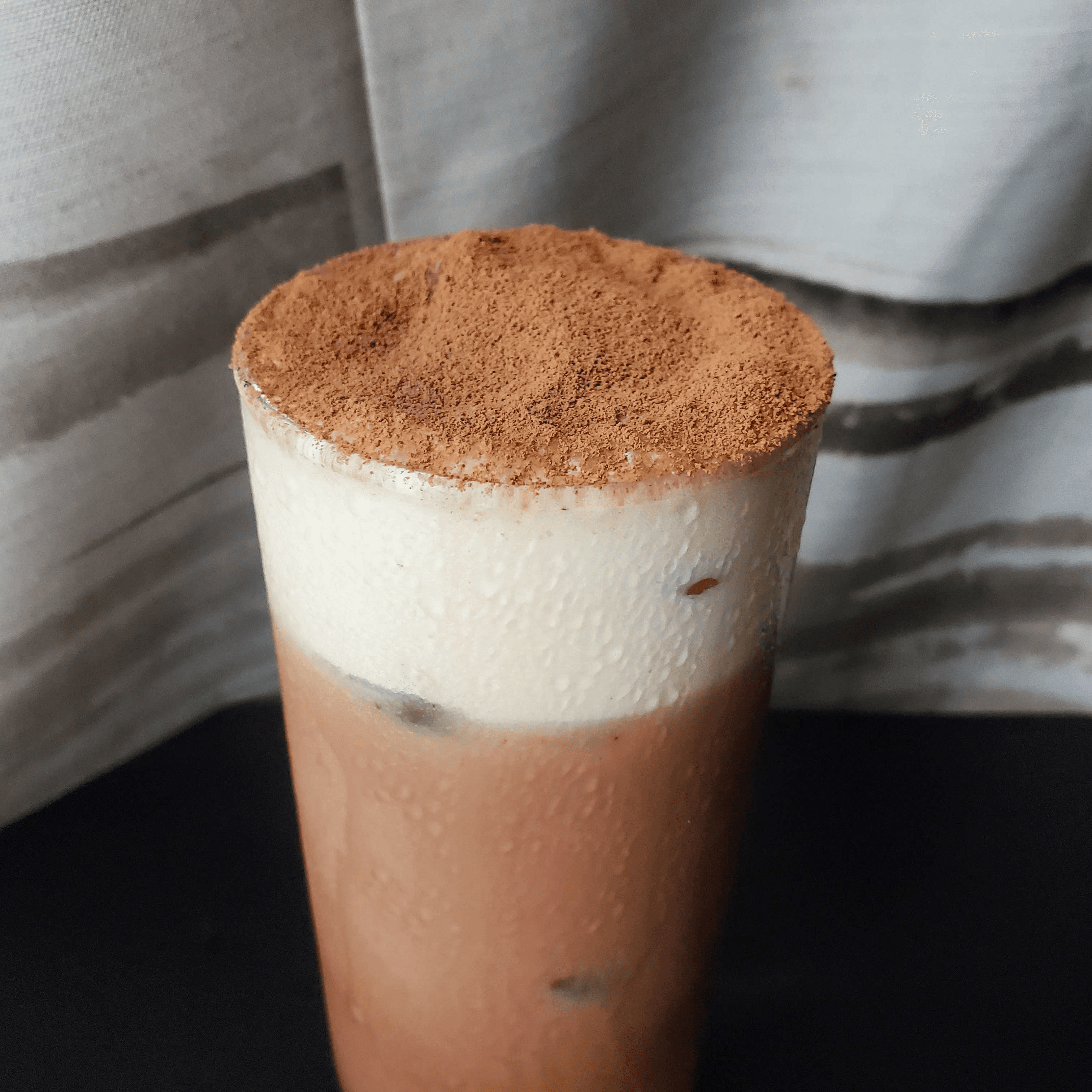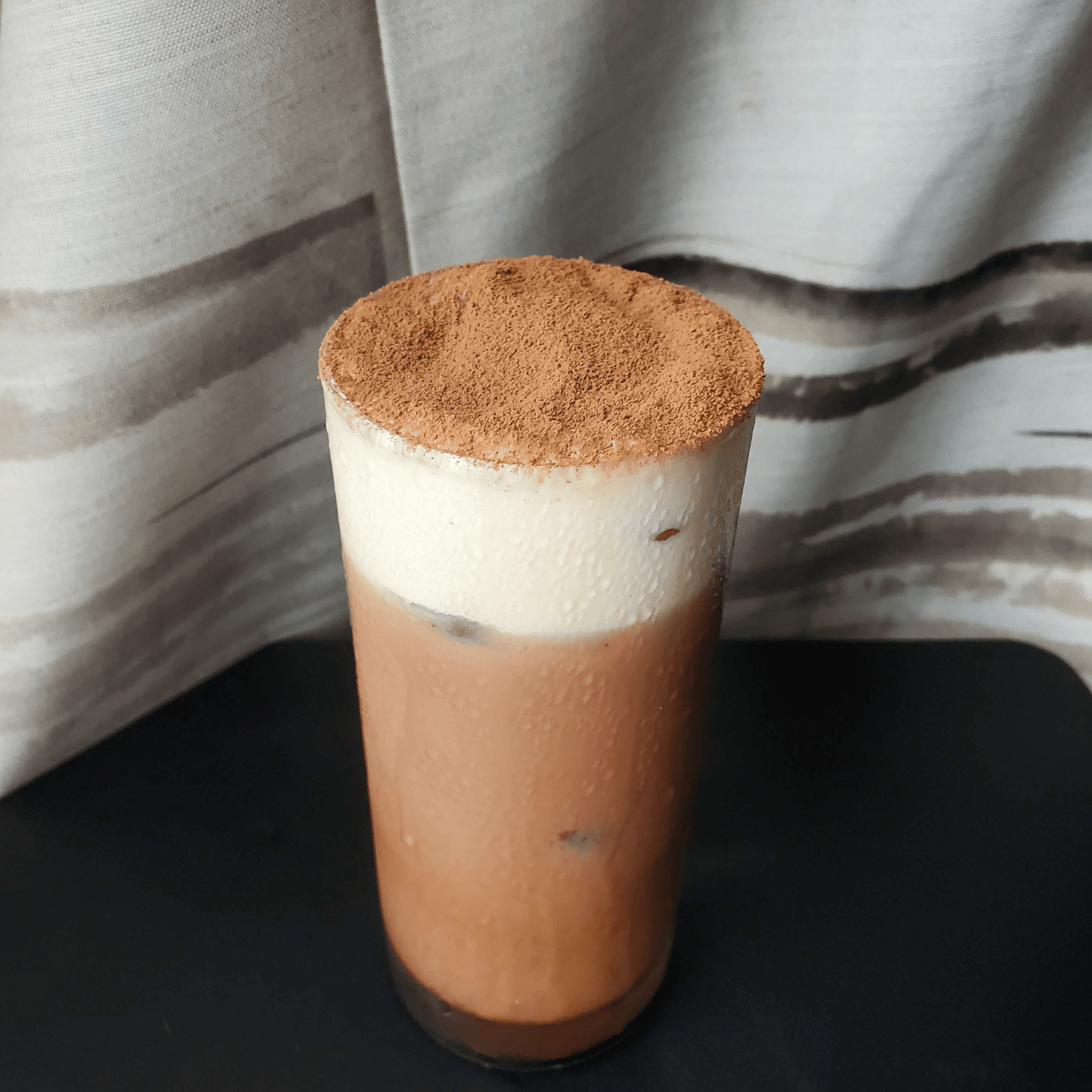 氷を入れたグラスに注ぎ、ヴィーガン生クリームとカカオパウダーをトッピングして完成です。