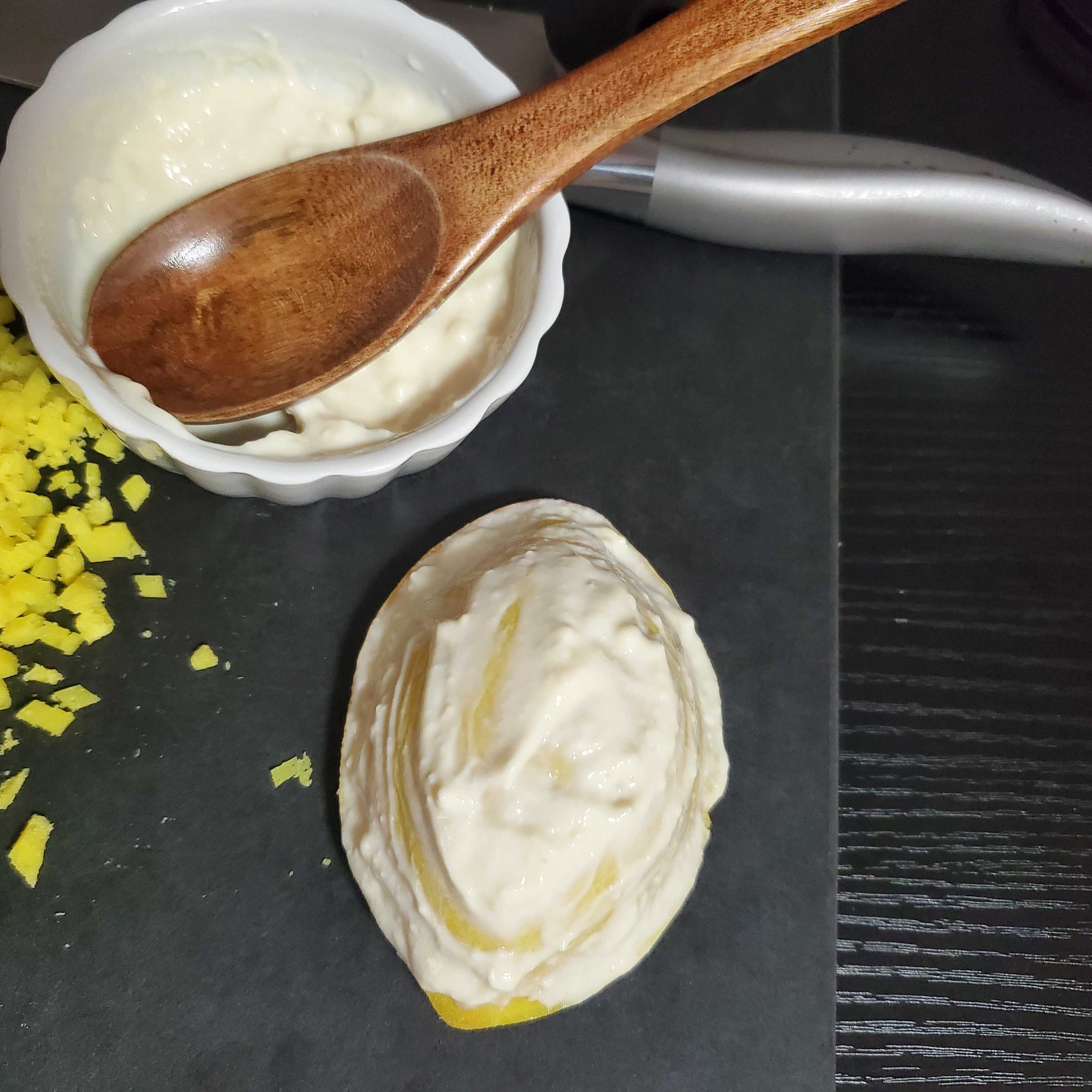 土台になるケーキ1個に豆乳ヨーグルトを適量塗ります。