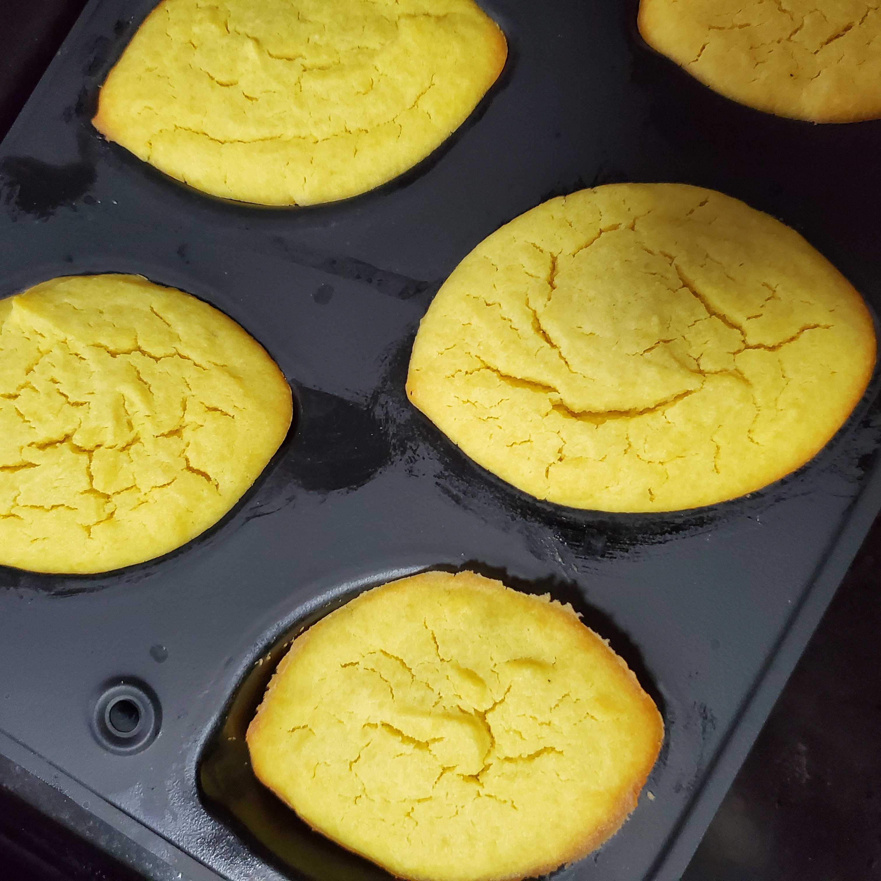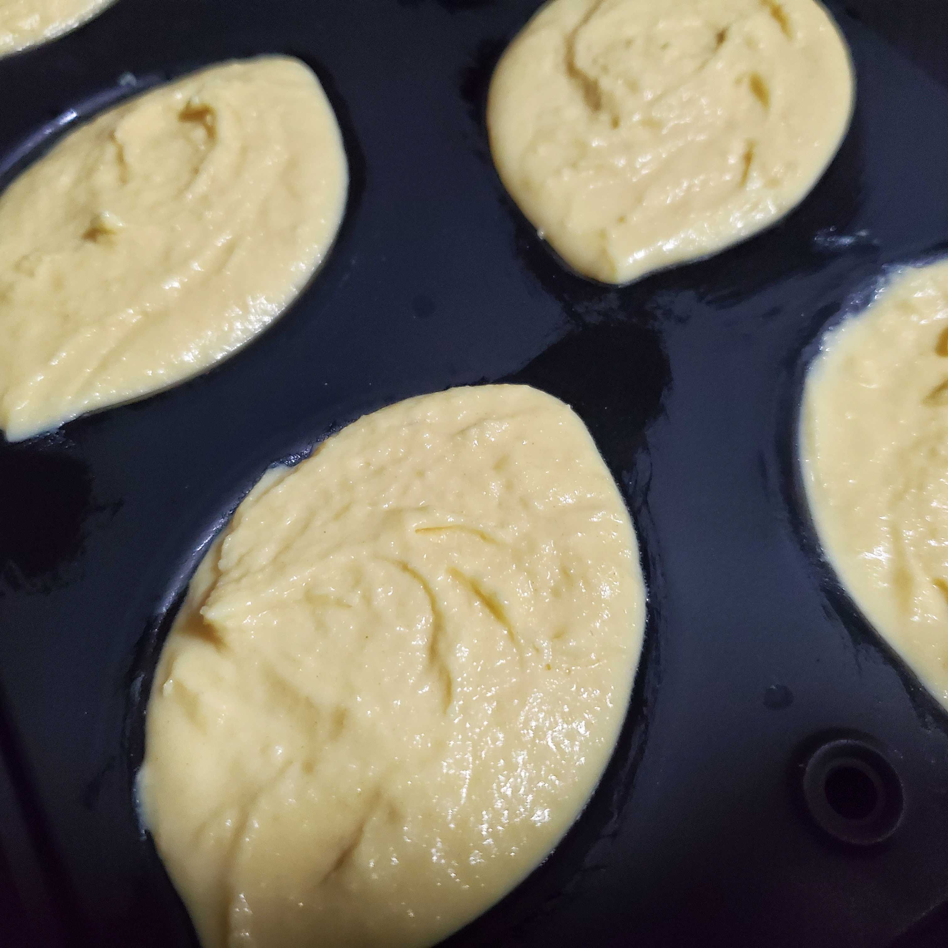 液体類を加えて混ぜ、型に流し込みます。(今回は11インチ6個分のレモン型を使用しています。18センチパウンド型1個分と同じ容量です。)