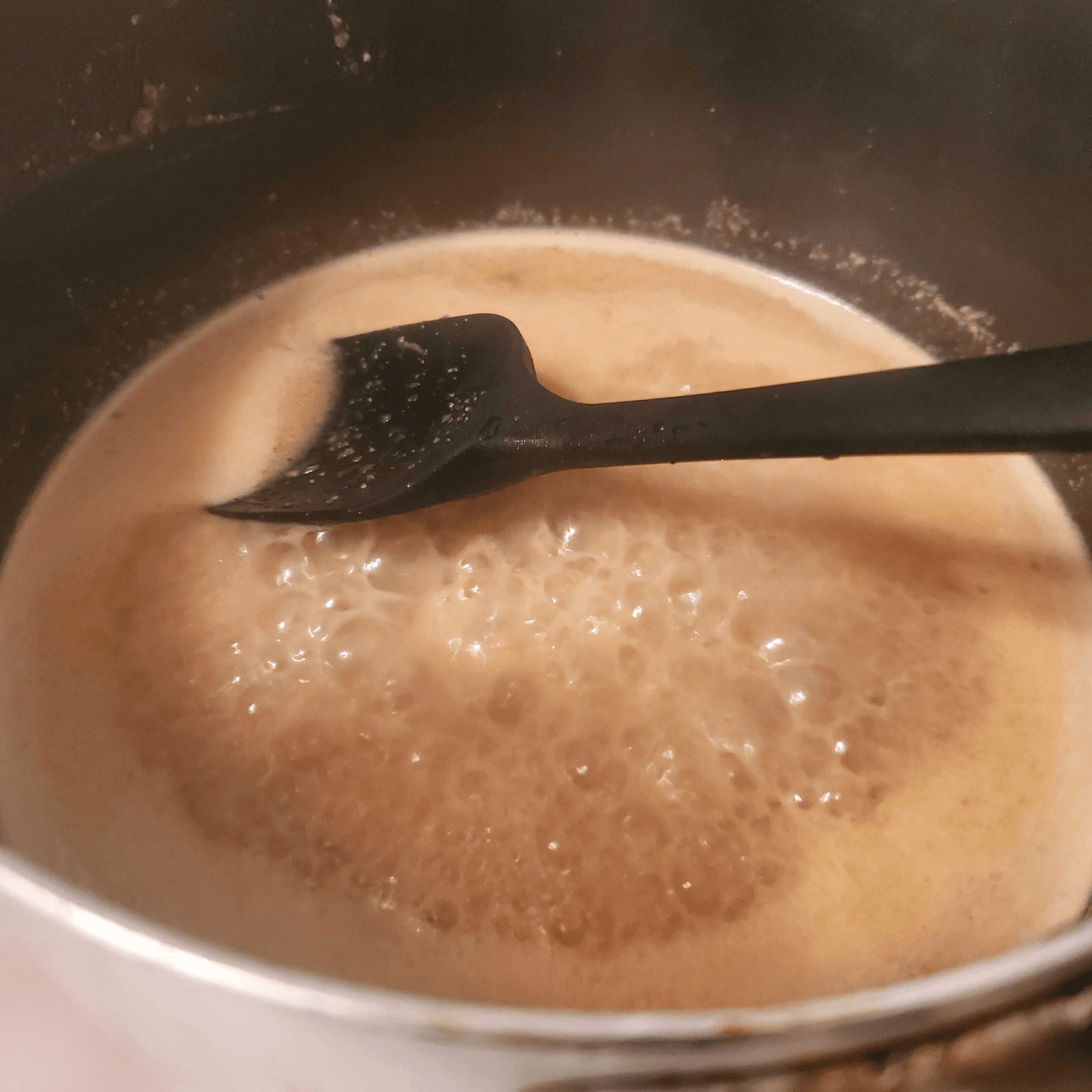ソース材料の豆乳以外をすべて混ぜ合わせて火にかけます。湧いたら豆乳を加えます。