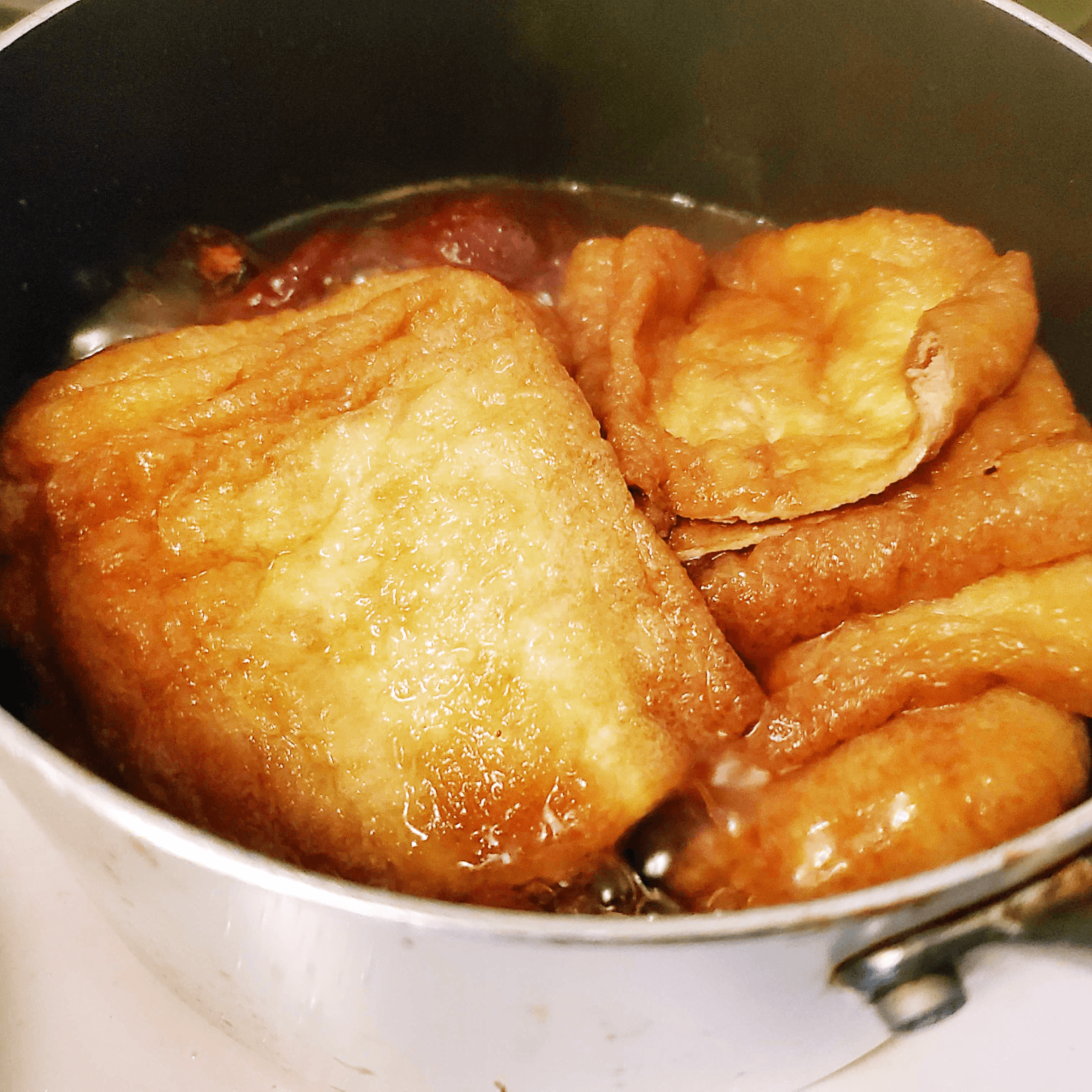 ・煮る時間はお好みで調節して下さい、そばに味を付けずに仕上げたので、今回は少し煮詰めて油揚げをしっかり目の味付けにしています。