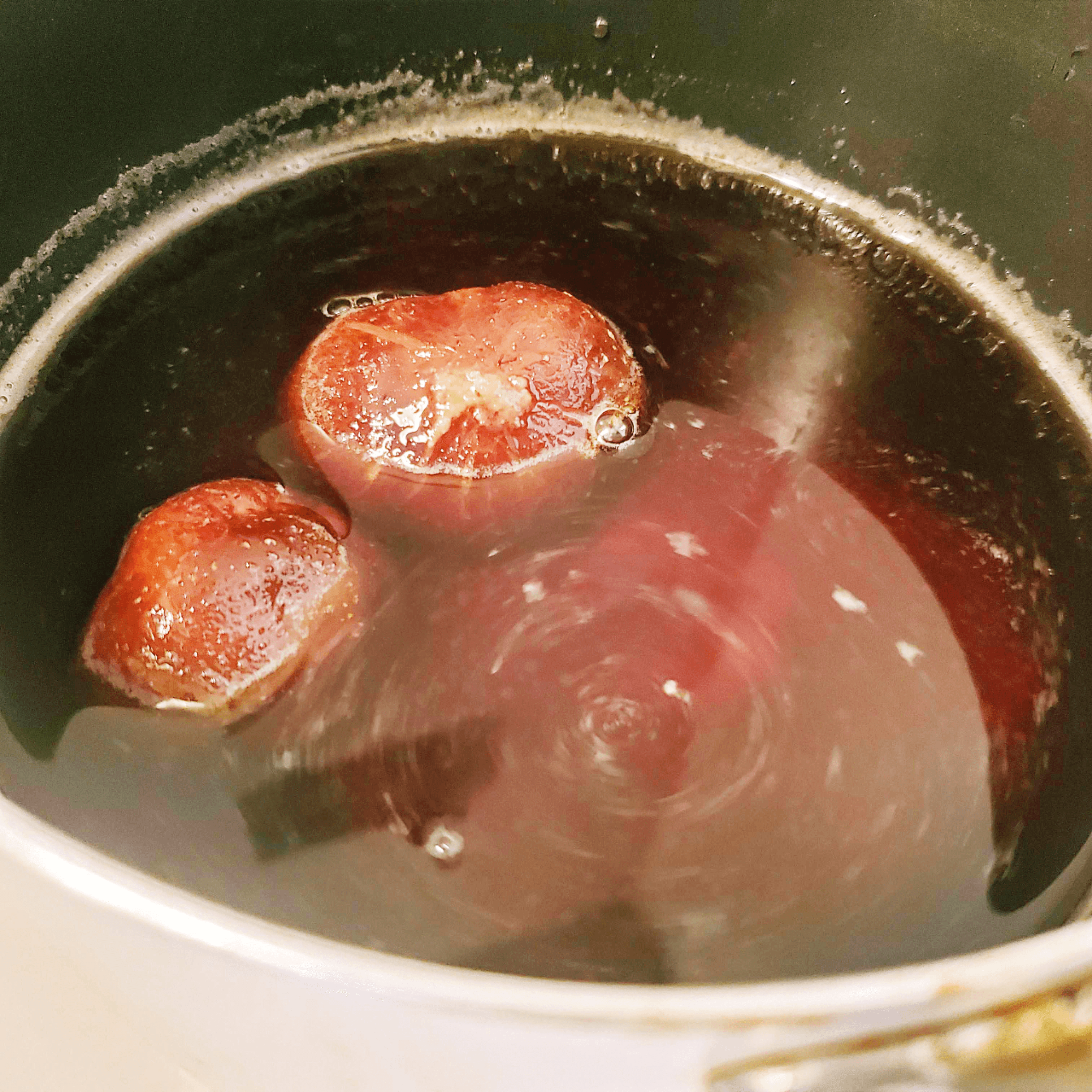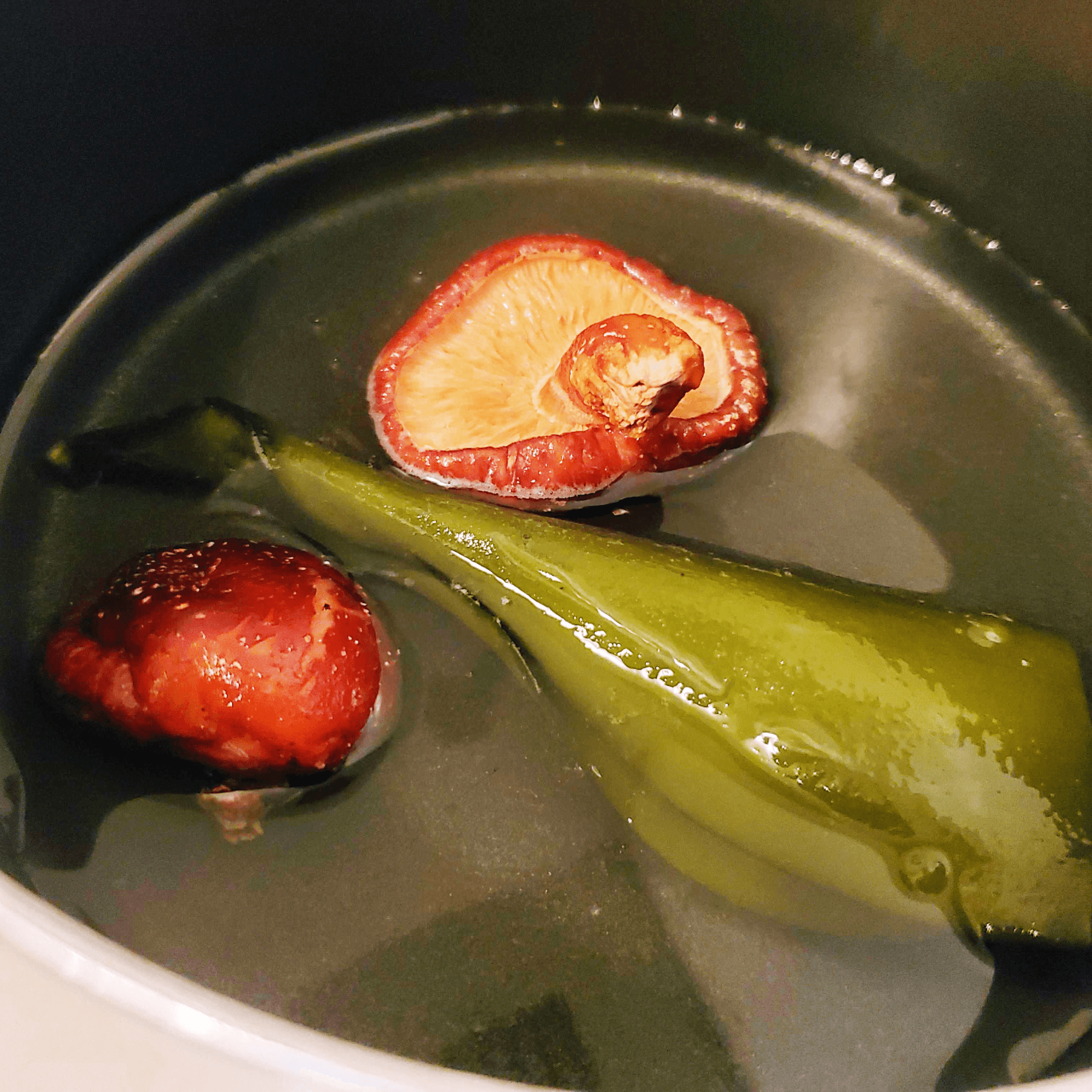 昆布、椎茸、水を鍋に入れて冷蔵庫で1時間ほど浸水し、だしを取ります。