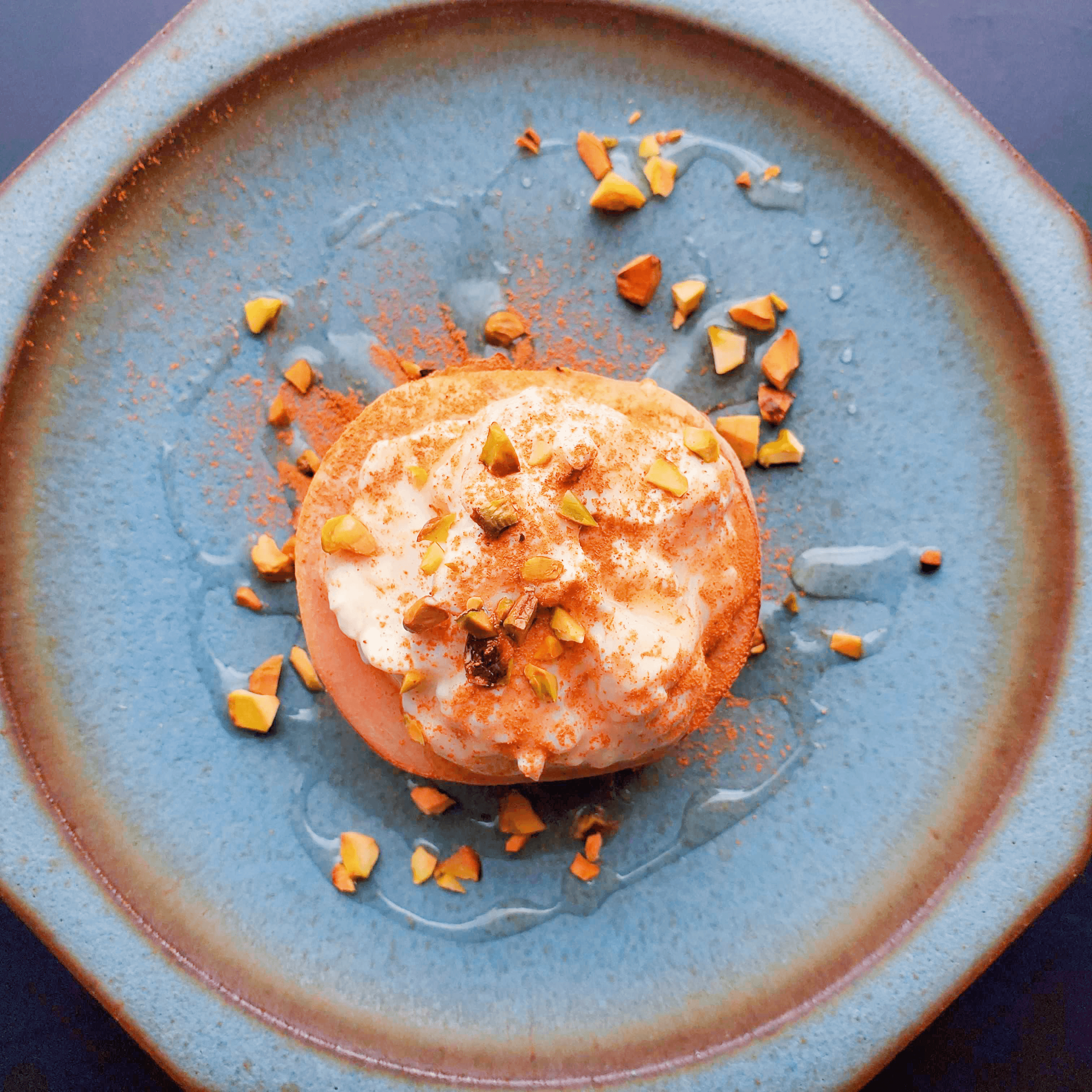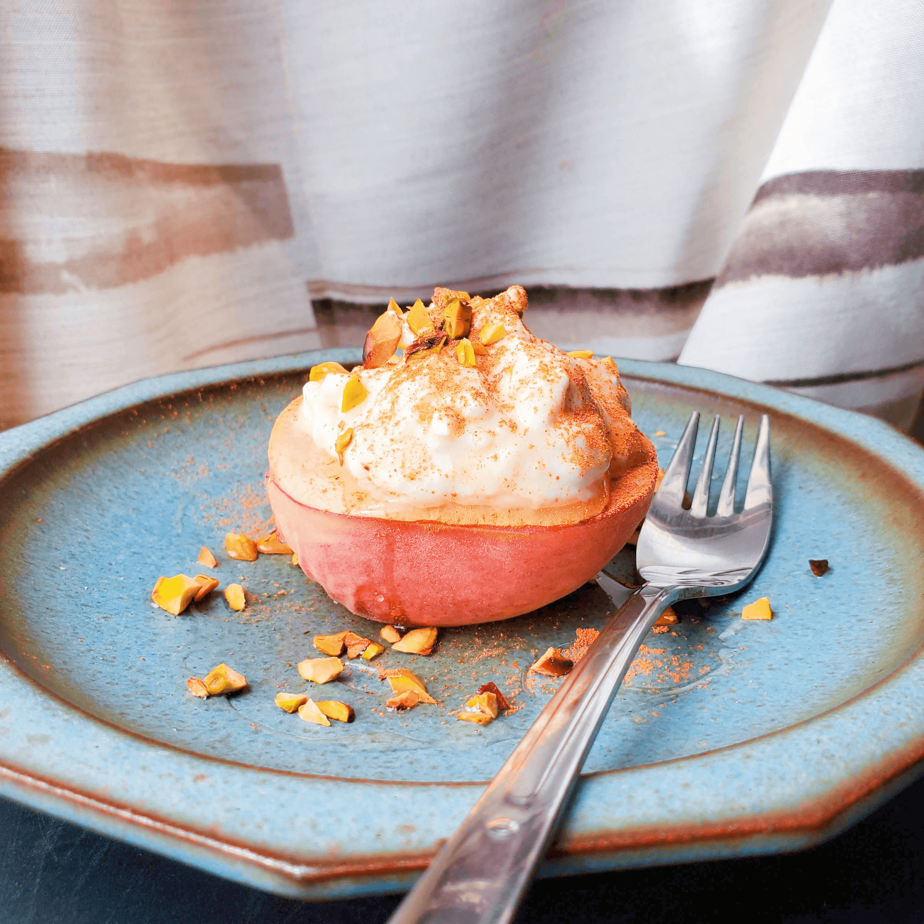 焼き上がった桃にヨーグルトを乗せて、お好みでピスタチオ、シナモン、アガベシロップをトッピングして完成です