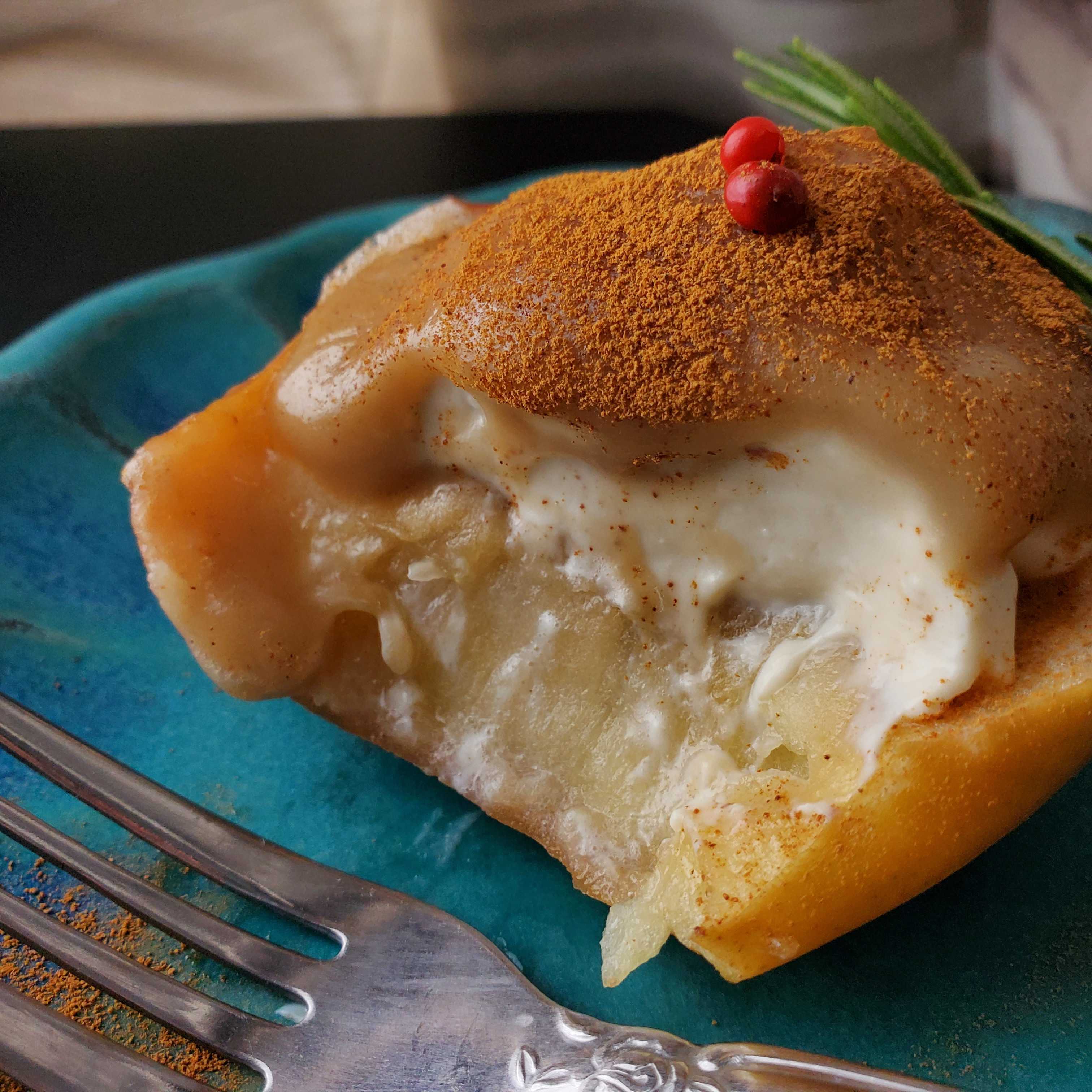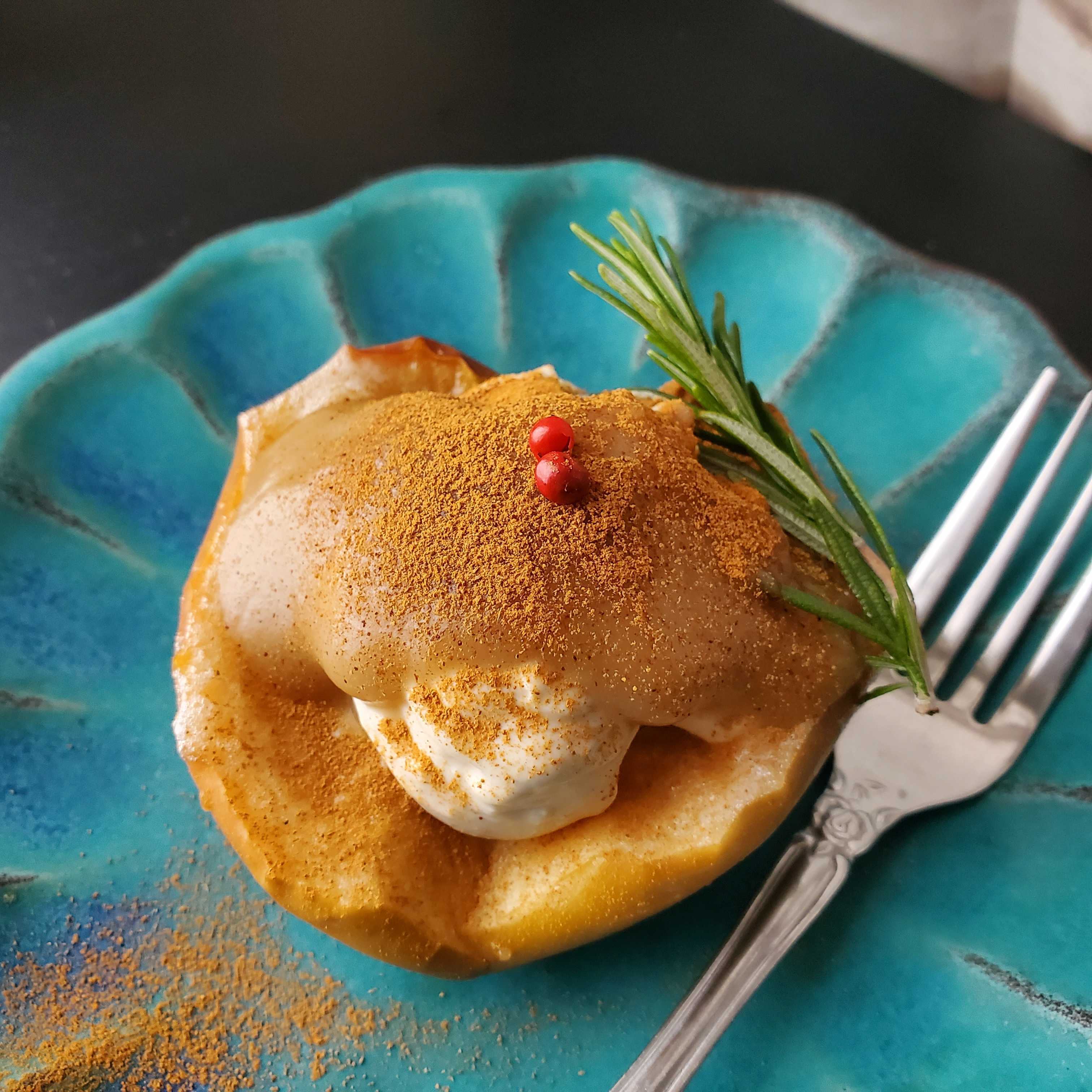 りんごが熱いうちに豆乳マスカルポーネとヴィーガンキャラメルクリームを乗せて、お好みでシナモンを振って完成です。