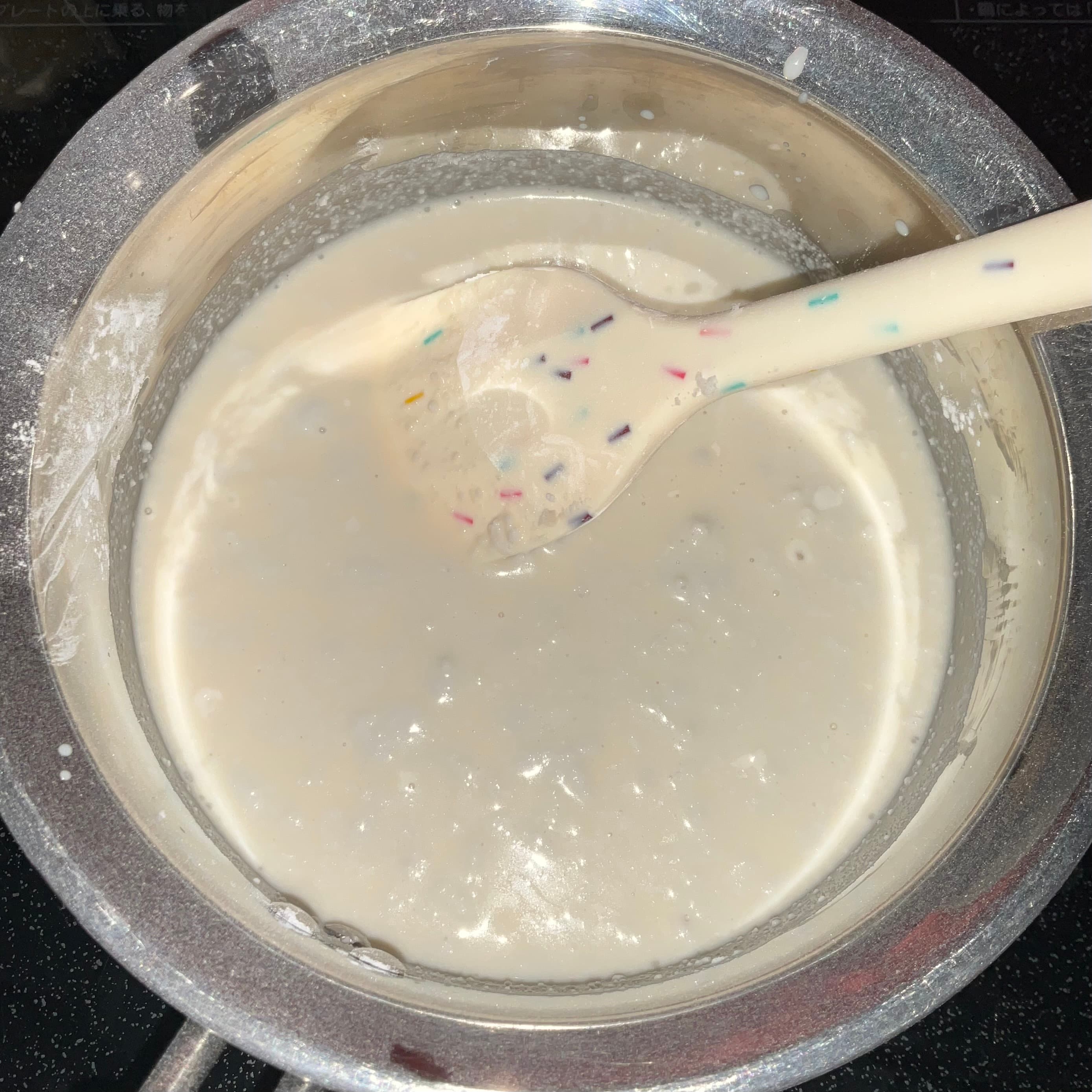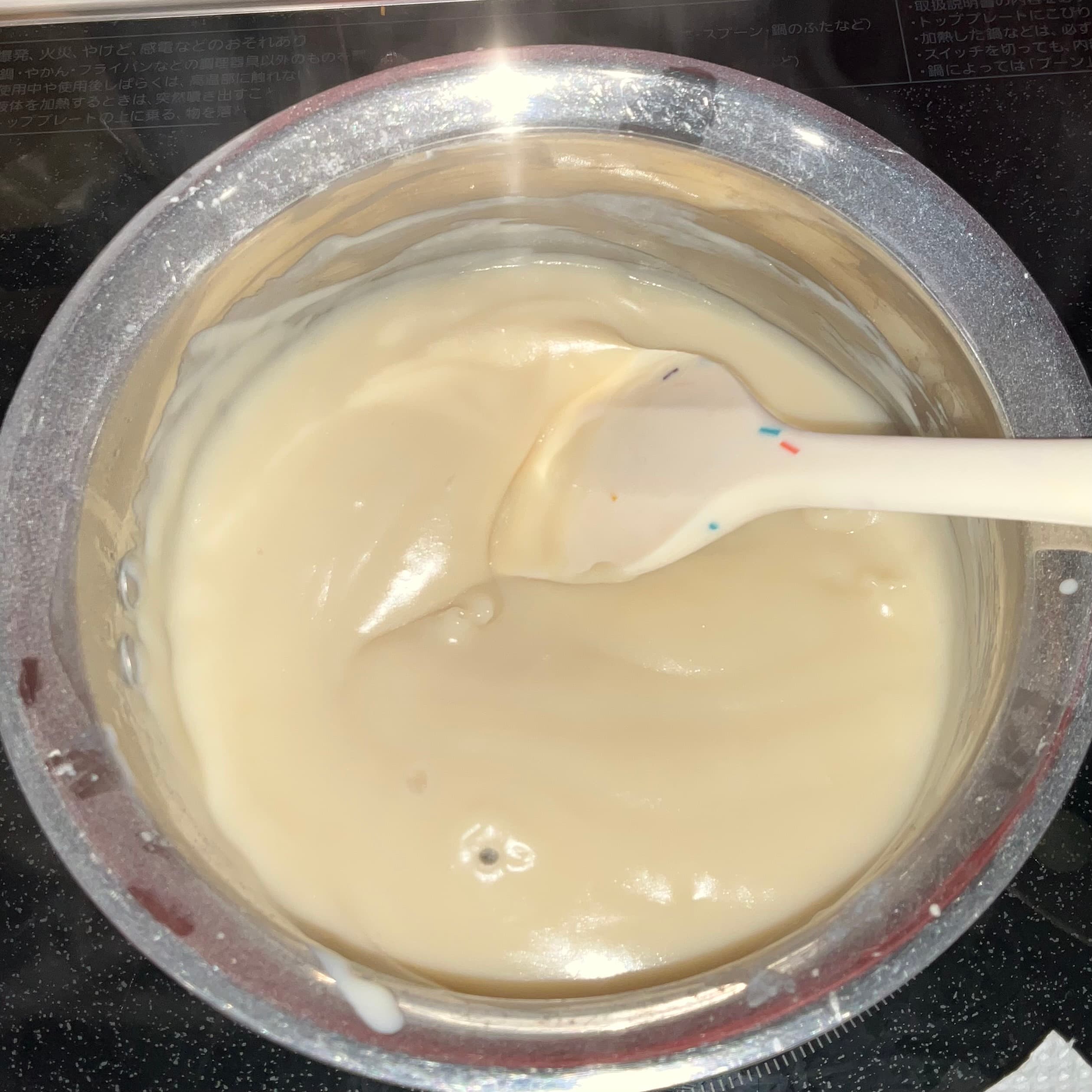 小鍋を弱火にかけ、焦げ付かないよう絶えずかき混ぜながら、フツフツしてとろみがつくまで2分ほど練り混ぜる。