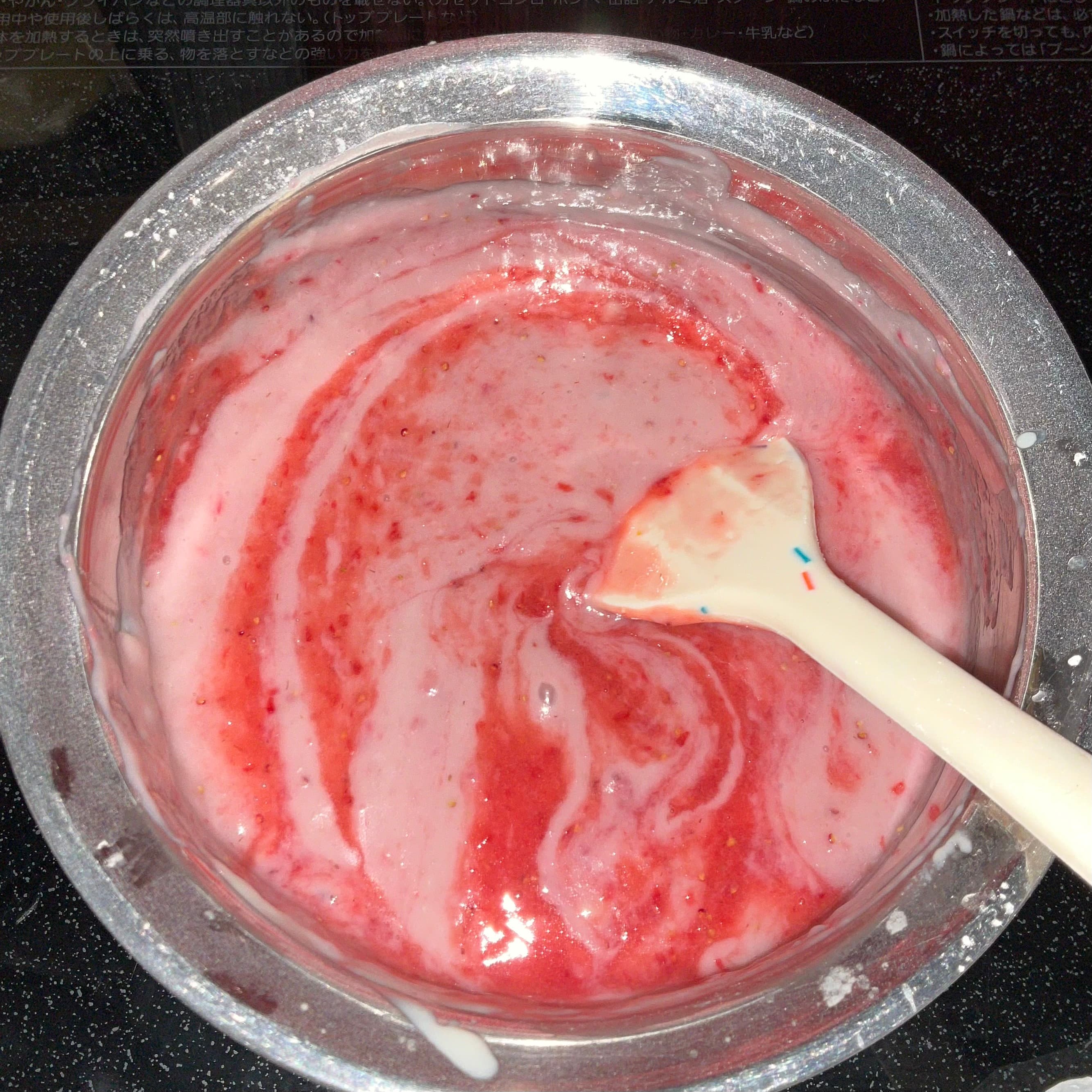 火を止め、①のイチゴを3回に分けて加え、その都度よく混ぜ合わせる。