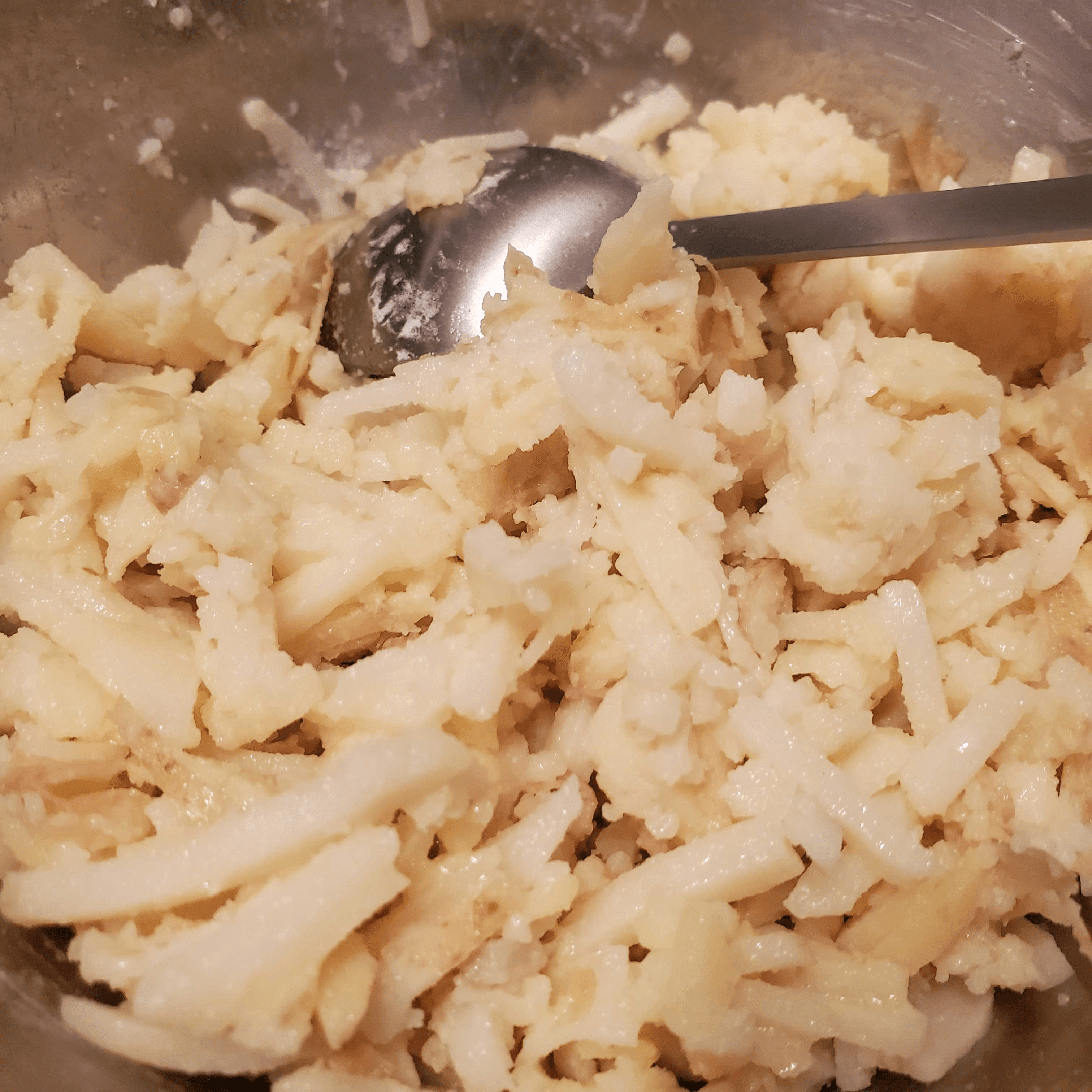 ・粗熱が取れたら千切りします。茹でてあるので勝手にある程度形が崩れて、ハッシュドポテト特有の粒感が自然とできます。