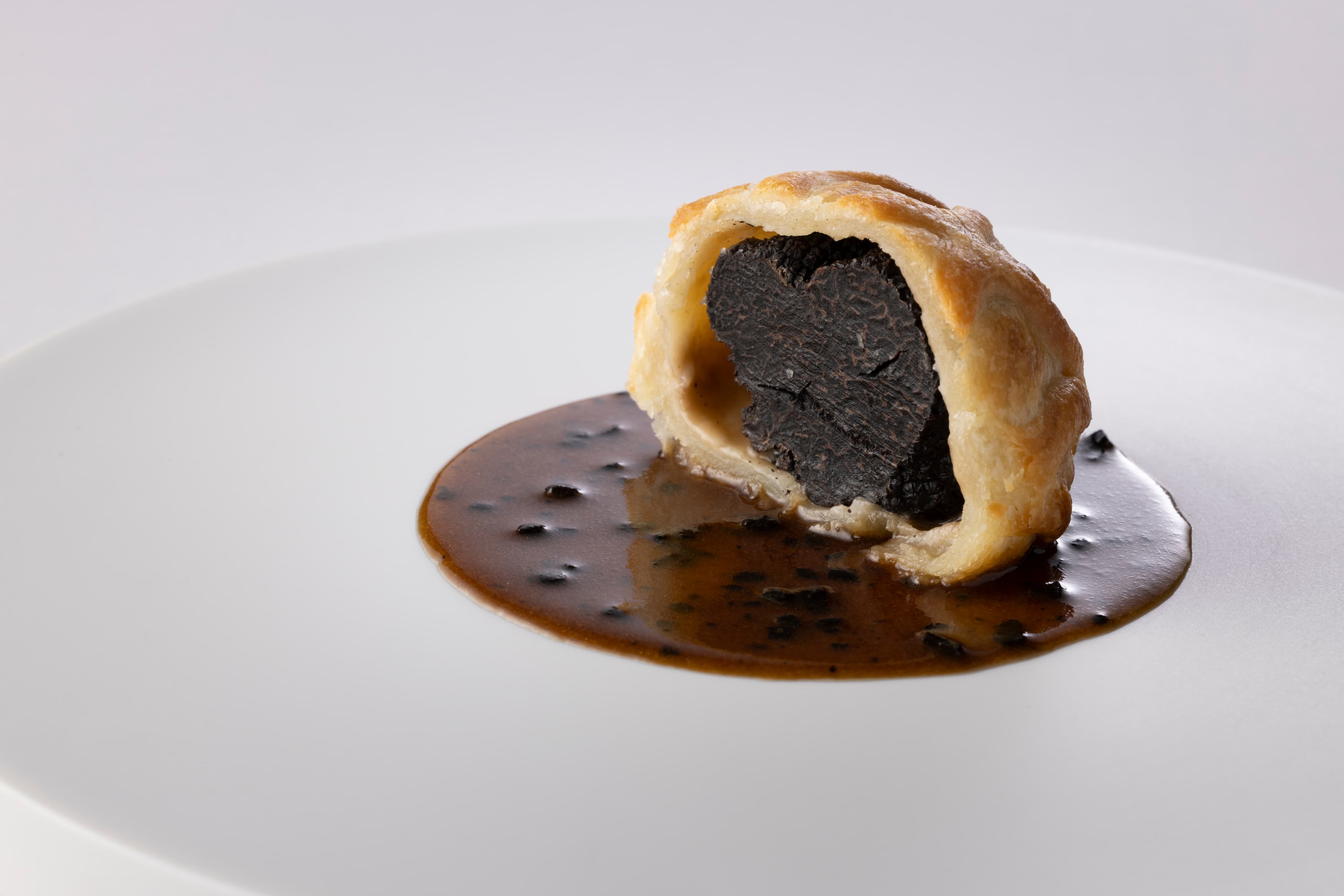 シェフ ヴォワザンのシグネチャーメニューでもある「黒トリュフのパイ包み焼き」をヴィーガン仕様にし、その時期の厳選された食材とともにコースに仕立てます。