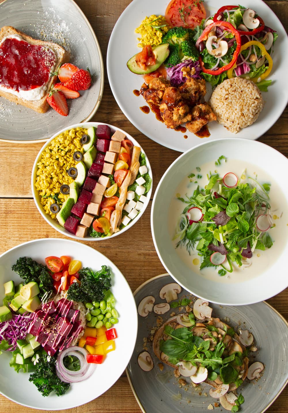 グルテンフリーや⾼プロテインなど⽬的や気分に合わせて楽しめるメニューや、ボリュームたっぷりのサラダ、プラントベースパテを使ったハンバーガー、ロコモコなど種類が豊富で、味にもこだわった商品をご⽤意しています。